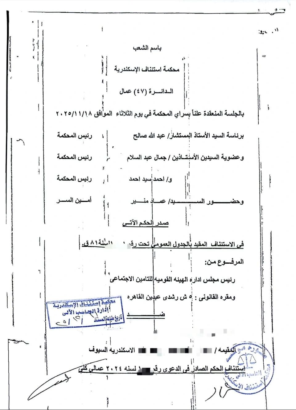 لم تقبل الهيئة القومية للتأمين الاجتماعي بالحكم وطعنت عليه بالاستئناف، مدعية وجود خطأ في تطبيق القانون، إلا أن محكمة استئناف الإسكندرية "الدائرة 47 عمال" فحصت القضية، وانتهت إلى قبول الاستئناف شكلا ورفضه موضوعا، وبالتالي تأييد حكم أول درجة بالكامل، حيث رأت محكمة الاستئناف أن أسباب حكم أول درجة جاءت "سائغة" ومتفقة مع صحيح الواقع والقانون، ولا يوجد في دفوع الهيئة ما ينال من سلامة الحكم الصادر لصالح الابنة.