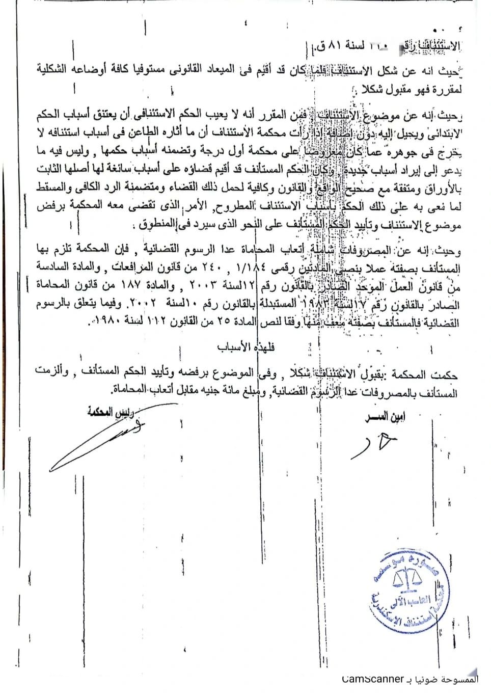 وجاء حكم الاستئناف كالتالي: حكمت المحكمة بقبول الاستئناف شكلا، وفي الموضوع برفضه وتأييد الحكم المستأنف، وألزمت المستأنف بالمصاريف عدا الرسوم القضائية، ومبلغ مائة جنيه مقابل اتعاب المحاماة.