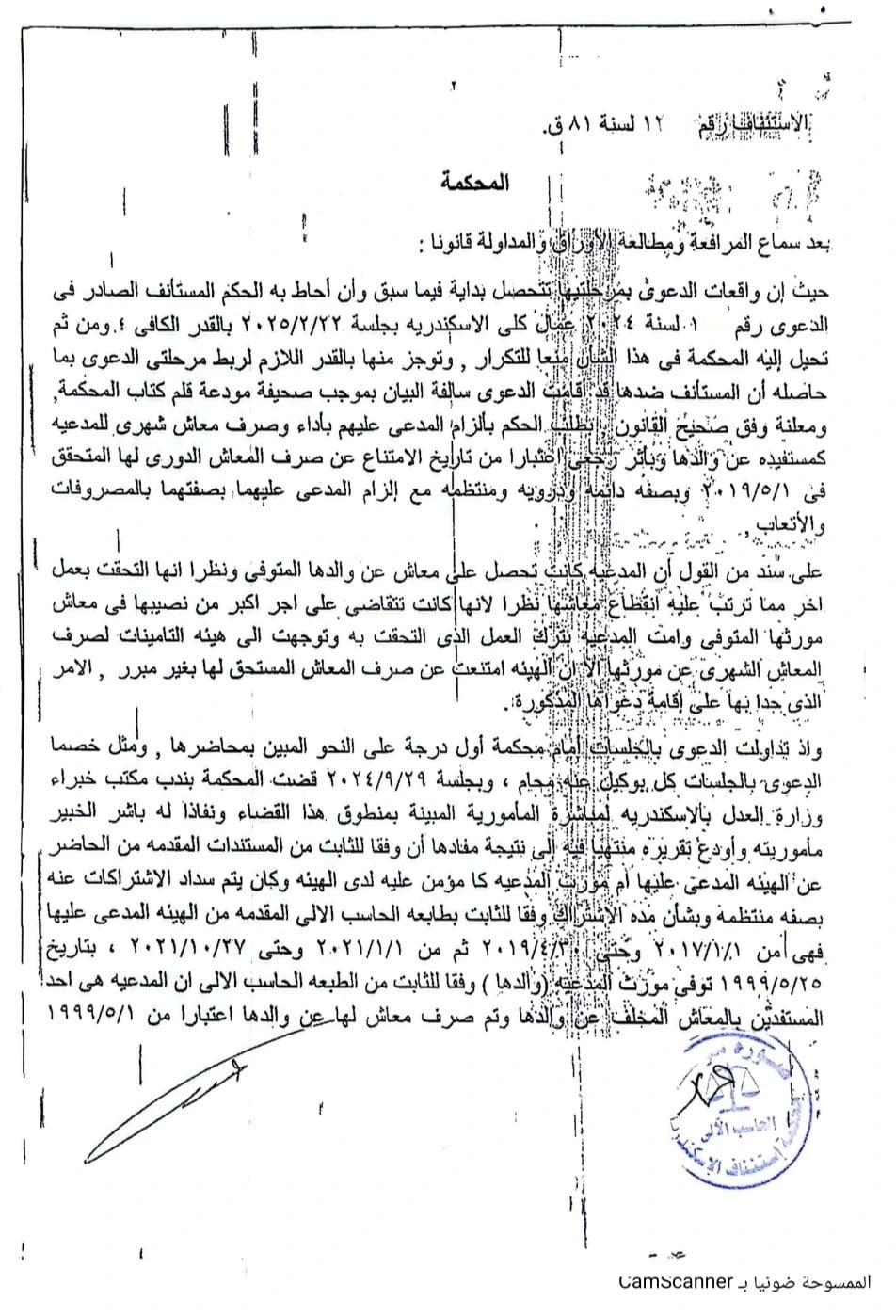 أيدت محكمة استئناف الإسكندرية، حكماً قضائيا مهما، وهو أن العمل ليس مسقطا نهائيا لحق الابنة في معاش والدها، حتى ولو كان الأب عاملا زراعيا مؤمنا عليه طبقا للقانون القديم، بل يعد "مانع مؤقت" ينتهي بانتهاء علاقة العمل، وعلى هيئة التأمينات الالتزام بإعادة الصرف فور تقديم ما يفيد ترك الخدمة.