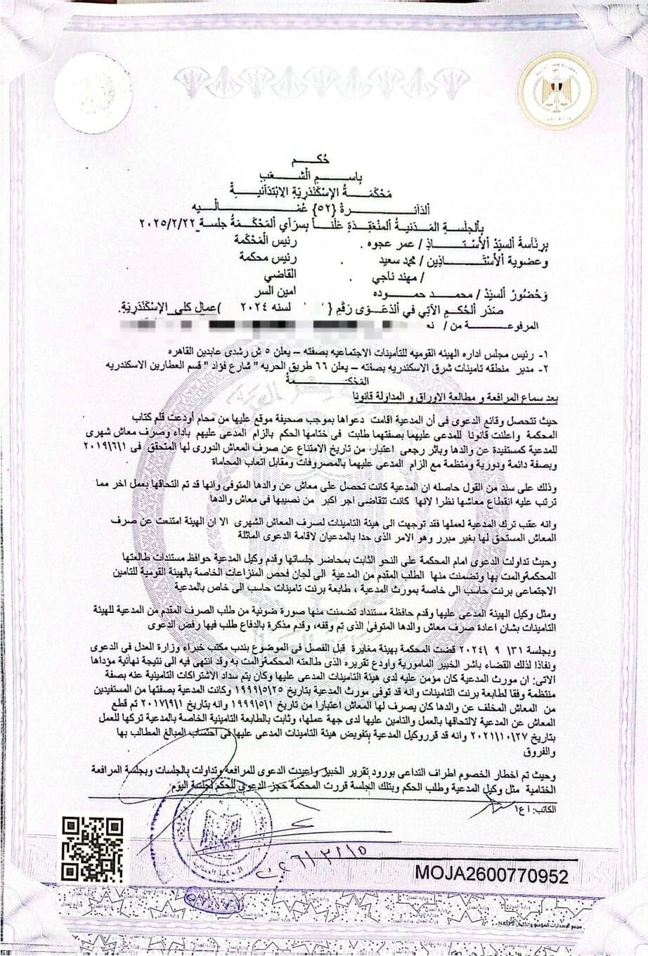 وكانت الابنة المستفيدة، رفعت دعوى ضد الهيئة القومية للتأمين الاجتماعي، تطالب فيها بصرف معاش والدها المتوفى المتوقف منذ عام 2019، وذلك بعدما قطعت الهيئة المعاش بسبب التحاقها بعمل، ولكنها عندما تركت العمل وتقدمت لإعادة الصرف، فواجهت رفضا ومماطلة من الهيئة، ما دفعها للجوء للقضاء.