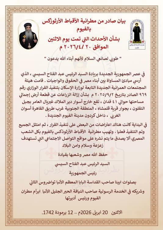أصدرت مطرانية الفيوم بيان توضيحى بشأن الأحداث التي تمت يوم الاثنين الموافق ٢٠٢٦/٤/٢٠ بدير أبوخشبة، بدأ بأستعاره آيه من الإنجيل " طوبي لصانعي السلام لأنهم أبناء الله يدعون " موضحا انه في عصر الجمهورية الجديدة بريادة الرئيس عبد الفتاح السيسي الذي أرسي مبادئ المساواة بين أبناء مصر في الحقوق والواجبات، قامت هيئة المجتمعات العمرانية الجديدة التابعة لوزارة الإسكان بتنفيذ القرار الوزاري رقم ٩٦٩ الصادر بتاريخ ۲۰۲۵/۹/۲م بشأن إزالة الزراعات عن قطعة أرض إجمالي مساحتها حوالي ٤١ فدان، تقع خارج أسوار دير الملاك غبريال العامر بجبل النقلون بجوار قرية قلمشاه المنطقة الجنوبية غرب طريق القاهرة أسوان الغربي داخل كردون مدينة الفيوم الجديدة .