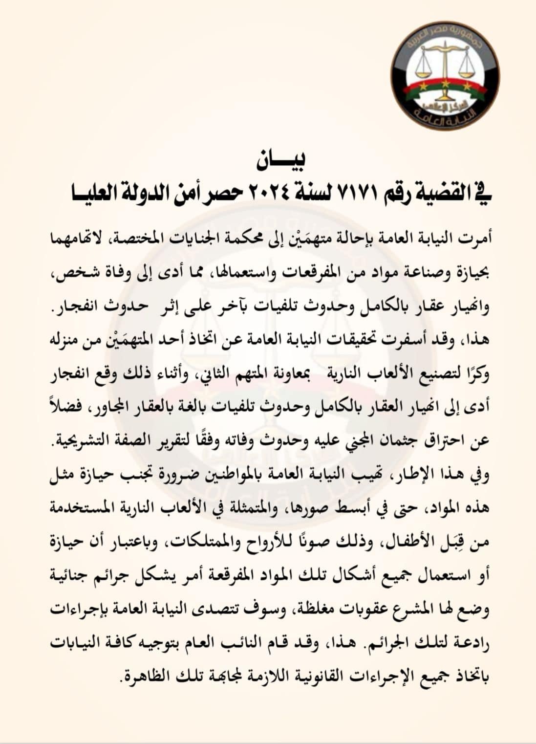 وأهابت النيابة العامة بالمواطنين ضرورة تجنب حيازة مثل هذه المواد، حتى في أبسط صورها والمتمثلة في الألعاب النارية المستخدمة من قبل الأطفال، وذلك صونًا للأرواح والممتلكات، وباعتبار أن حيازة أو استعمال جميع أشكال تلك المواد المفرقعة أمر يشكل جرائم جنائية وضع لها المشرع عقوبات مغلظة، وسوف تتصدى النيابة العامة بإجراءات رادعة لتلك الجرائم.