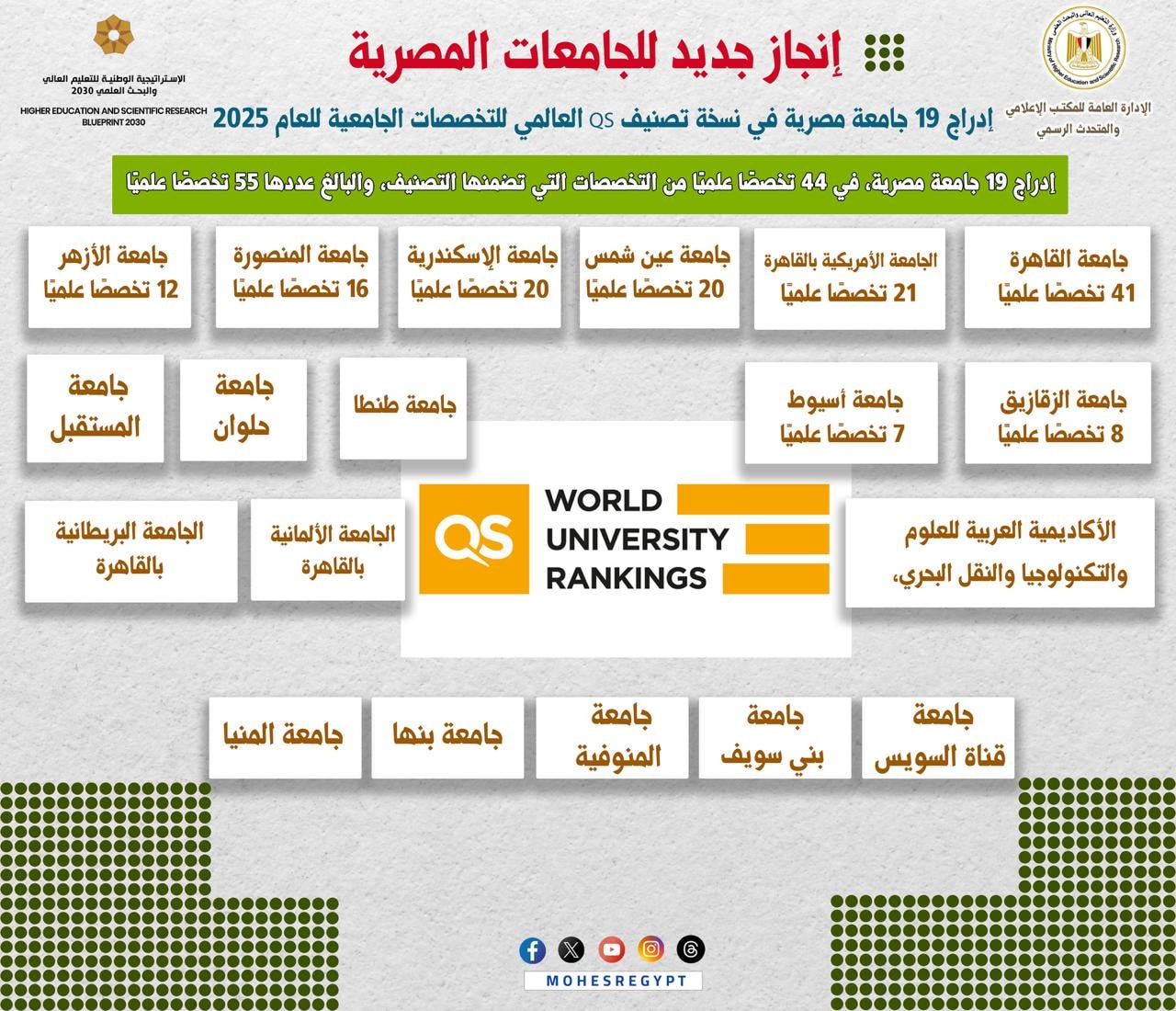 أعلن تصنيف QS العالمي نتائج نسخته للتخصصات الجامعية للعام 2025، والتي أظهرت إدراج 19 جامعة مصرية، في 44 تخصصًا علميًا من التخصصات التي تضمنها التصنيف، والبالغ عددها 55 تخصصًا علميًا، بزيادة في أعداد الجامعات المٌدرجة بالتصنيف عن العام الماضي، وكذلك زيادة كبيرة في أعداد الجامعات المصرية داخل كل تخصص علمي.
