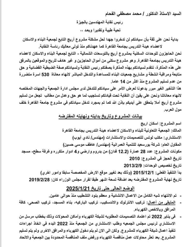 وكان عدد من ملاك مشروع أريج بالتوسعات الشمالية تقدموا بشكوى لنقابة المهندسين من أعضاء هيئة التدريس جامعة القاهرة، بسبب تأخر تسليم المشروع أكثر من 14 عاما، مطالبين نقيب المهندسين بالتدخل بصفة الضبطية القضائية و حق متابعة ومراقبة انشطة ومشاريع جمعيات البناء للمساعدة والتدخل المباشر لانهاء معاناة 530 أسرة متضررة من عدم تسليم المشروع منذ أكثر من 14 عاما.