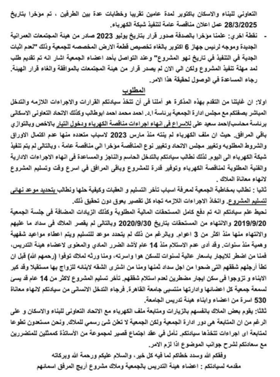 كما طالب الشاكون النقابة بمخاطبة الجمعية لمعرفة أسباب تأخر التسليم والعقبات وكيفية حلها وتحديد موعد نهائي لتسليم المشروع واتخاذ الاجراءات اللازمه تجاه كل تقصير يعوق دون تحقيق ذلك. نحيط علم سيادتكم انه تم دفع كامل المستحقات المالية المطلوبة وكذلك الزيادات المضافة في جلسة الجمعية 2019/9/20 والانتهاء من المستحقات بتاريخ 2020/9/30 وبالتالي لم يقصر الملاك في سداد ما عليهم والانتهاء منها منذ اكثر من 3 أعوام.