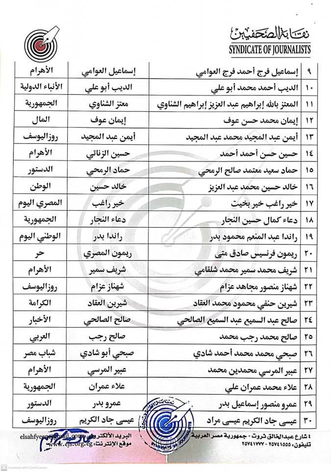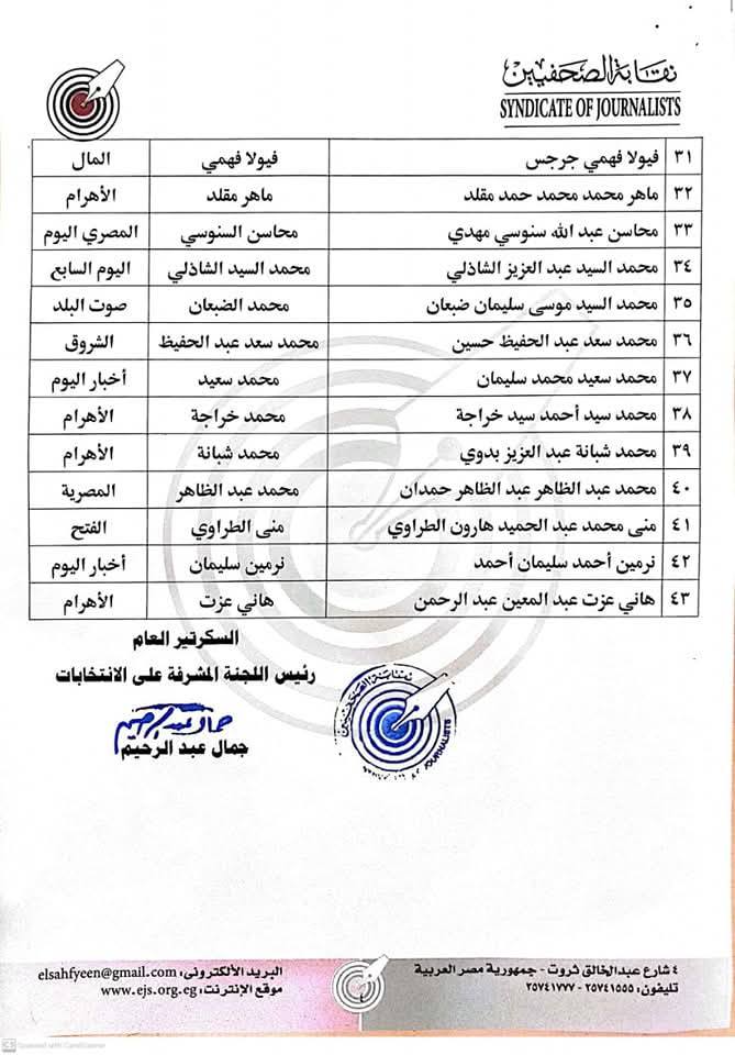 وأعلنت اللجنة المشرفة على انتخابات التجديد النصفي لنقابة الصحفيين، الكشوف النهائية للمرشحين على مقعد نقيب الصحفيين، و6 من أعضاء مجلس النقابة، حيث بلغ عدد المرشحين 51 مرشحًا بينهم 8 على مقعد النقيب، و43 لعضوية المجلس بعد تنازل الزميلين أحمد فتحي أحمد محمد «أخبار اليوم»، وعبد الجواد أبوكب «روزاليوسف» عن الترشح لمقعد نقيب الصحفيين.