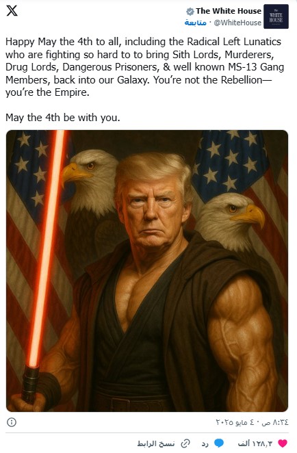 لا يزال الرئيس الأمريكي دونالد ترامب يثير حالة الجدل والسخرية ليس فقط على المستوى السياسي ولكن من خلال تصرفاته وتدويناته ونشره لصور خاصة له يتم تركيبها من خلال الذكاء الاصطناعي كظهوره مرة بشخصية "الملك ترامب"، وقبل عدة أيام يظهر في زي بابا الفاتيكان ، واليوم ظهر في صورة مفتول العضلات مستوحاة من سلسلة "حرب النجوم" الشهيرة شاهرًا “السيف الأحمر” الذي يرمز في السلسلة إلى الجانب المظلم أو الأشرار، والأزمة الأكبر أن من ينشر تلك الصور الساخرة هو حساب البيت الأبيض على منصة «إكس».