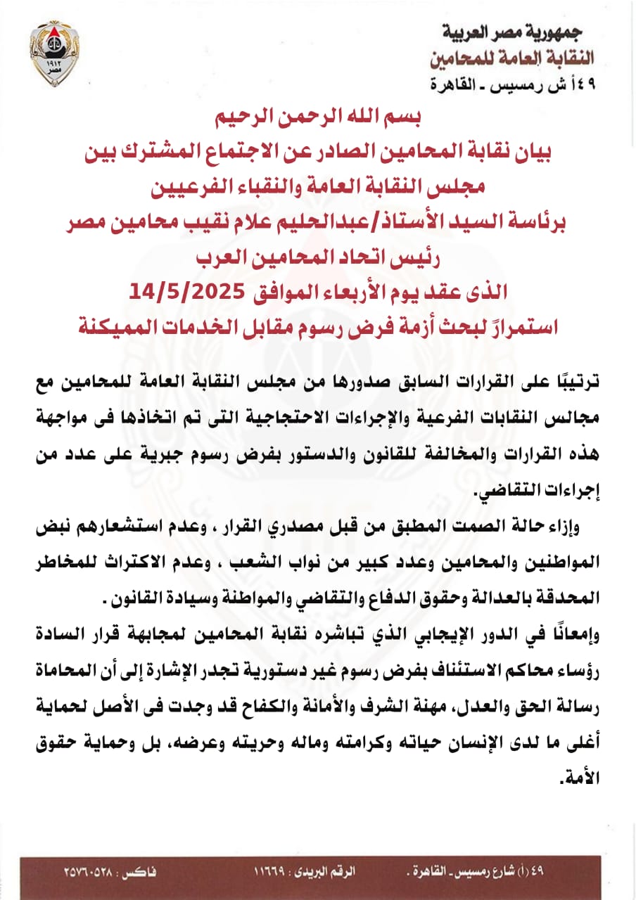وبحسب بيان أصدرته نقابة المحامين، عقد أعضاء مجلس النقابة العامة ونقباء الفرعيات، اجتماعا لمواجهة القرار الصادر من مجلس رؤساء محاكم الاستئناف بفرض رسوم تحت مسمى مقابل خدمات مميكنة، وانتهى الاجتماع إلى أنه ترتيبًا على القرارات السابق صدورها من مجلس النقابة العامة للمحامين مع مجالس النقابات الفرعية والإجراءات الاحتجاجية التى تم اتخاذها فى مواجهة هذه القرارات والمخالفة للقانون والدستور بفرض رسوم جبرية على عدد من إجراءات التقاضي.