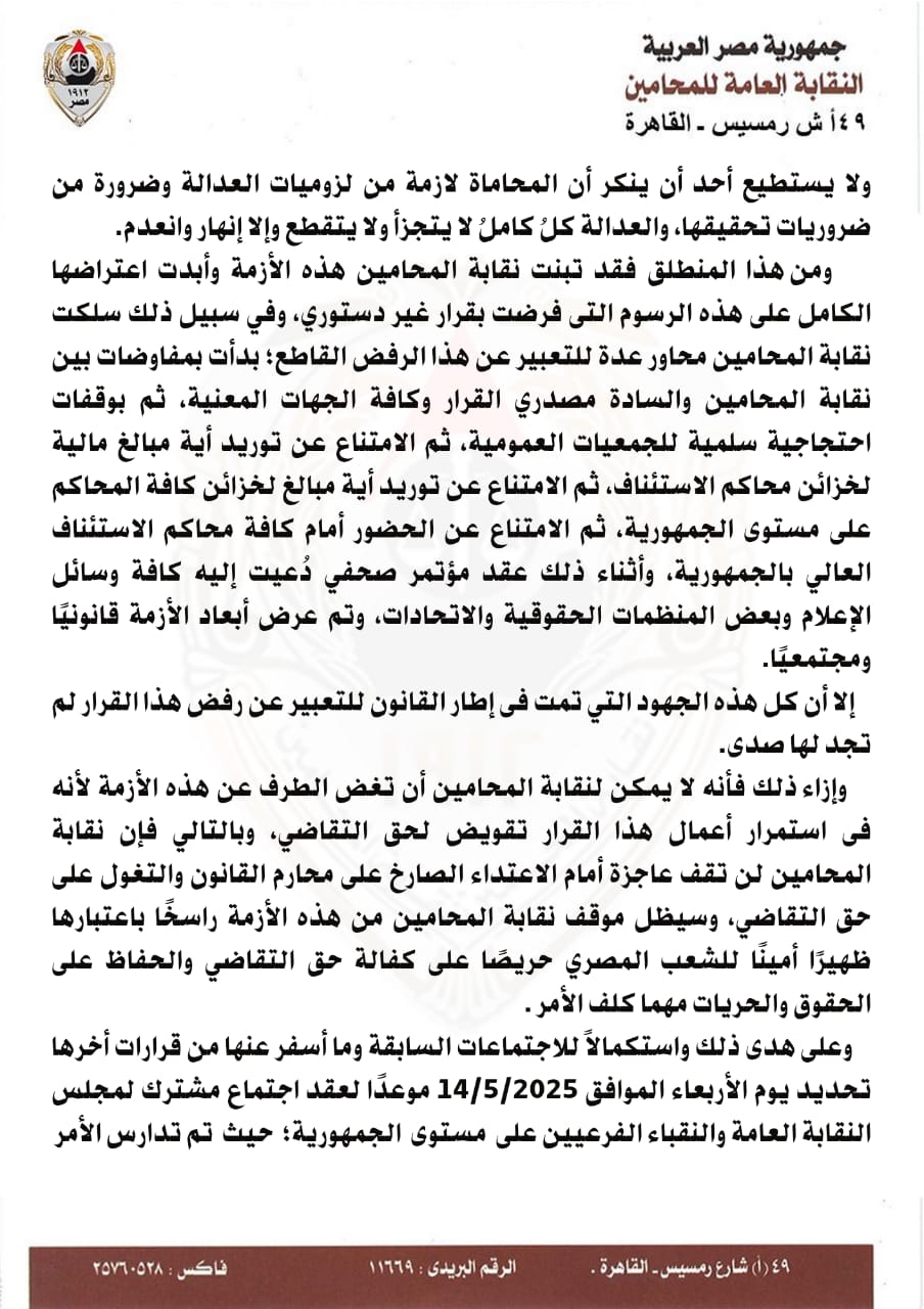 وإزاء ذلك فأنه لا يمكن لنقابة المحامين أن تغض الطرف عن هذه الأزمة لأنه فى استمرار أعمال هذا القرار تقويض لحق التقاضي، وبالتالي فإن نقابة المحامين لن تقف عاجزة أمام الاعتداء الصارخ على محارم القانون والتغول على حق التقاضي، وسيظل موقف نقابة المحامين من هذه الأزمة راسخًا باعتبارها ظهيرًا أمينًا للشعب المصري حريصًا على كفالة حق التقاضي والحفاظ على الحقوق والحريات مهما كلف الأمر .