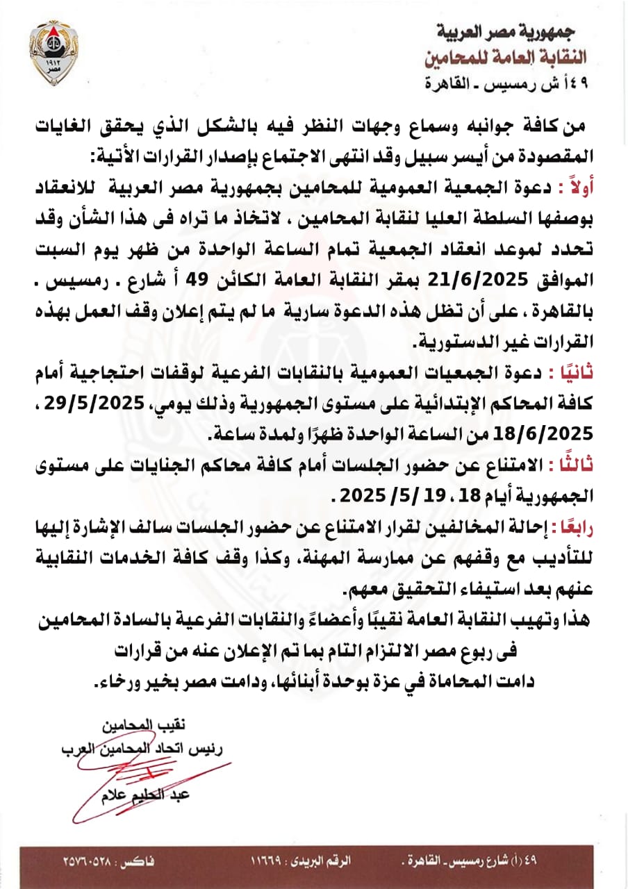 ودعت نقابة المحامين الجمعية العمومية للمحامين بجمهورية مصر العربية للانعقاد بوصفها السلطة العليا لنقابة المحامين، لاتخاذ ما تراه فى هذا الشأن وقد تحدد لموعد انعقاد الجمعية تمام الساعة الواحدة من ظهر يوم السبت الموافق 21/6/2025 بمقر النقابة العامة بالقاهرة، على أن تظل هذه الدعوة سارية ما لم يتم إعلان وقف العمل بهذه القرارات غير الدستورية.