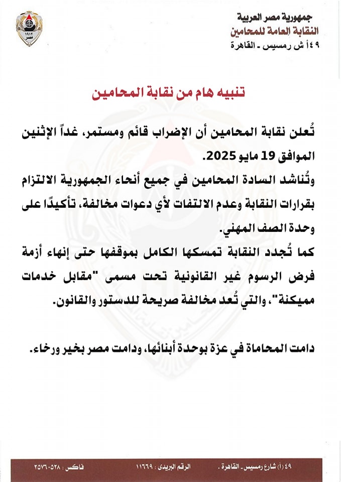 وشددت نقابة المحامين، أن المرحلة الحالية تتطلب المزيد من التكاتف والالتزام بما يخدم الوطن ويحافظ على هيبة النقابة وكرامة المحامي.