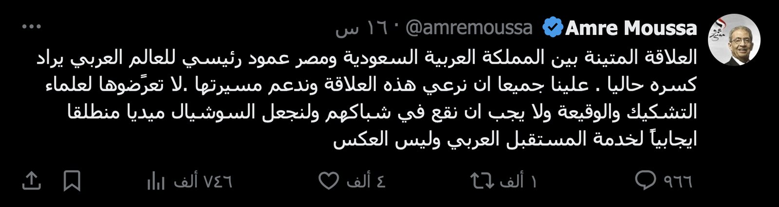 وكتب عمرو موسى عبر صفحته على "إكس"، تويتر سابقا: "العلاقة المتينة بين المملكة العربية السعودية ومصر عمود رئيسي للعالم العربي يراد كسره حاليا".