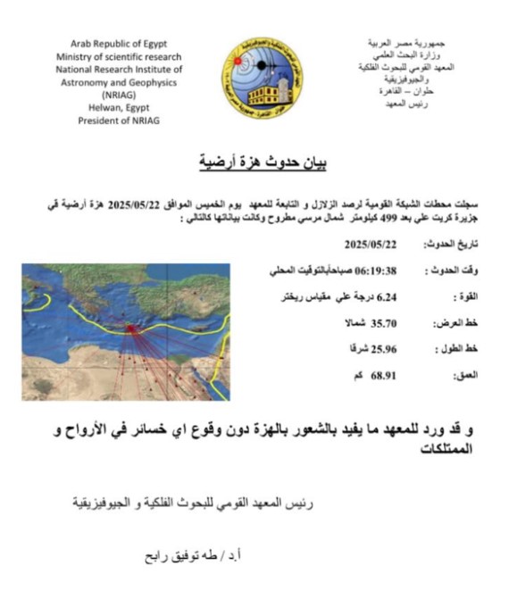 للمرة الثانية خلال فترة أقل من 10 أيام يشعر سكان القاهرة والاسكندرية بـ زلزال فجر اليوم بعد الزلزال الذي ضرب مصر يوم 14 مايو الجاري ، وقال المعهد القومي للبحوث الفلكية والجيوفيزيقية في مصر، إن محطات الشبكة القومية لرصد الزلازل سجلت هزة أرضية في جزيرة كريت على بعد 499 كيلومترا شمالي مرسى مطروح غربي مصر.