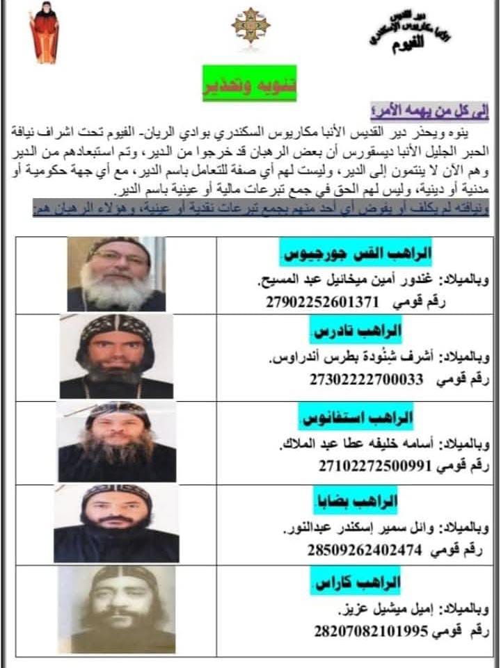 أصدر الأنبا ديسقوروس - المشرف على دير الأنبا مكاريوس السكندرى بوادى الريان - الفيوم تحذير من بعض طلاب الرهبنه ممن انضموا مؤخرا للإلتحاق بسلك الرهبنه ولكن تم إستبعادهم (لعدم استيفائهم للشروط الروحية والسلوكية المقرره فى الخدمه) لكنهم لازالوا يتعاملون مع الشعب على انهم رهبان ينتمون للدير ويعتبروا حاليا منتحلي صفة رهبان والدير برىء من افعالهم وسلوكهم ٬ موضحا خلال البيان التحذيرى انه لم يكلفهم بجمع تبرعات سواء عينية او نقديه .