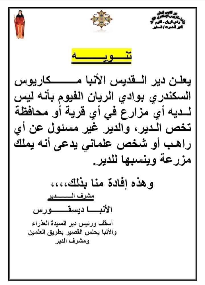 ونفى الدير إمتلاكه لأى مزارع أو أراضى فى اى قرية بالفيوم او محافظات اخرى وعدم مسؤوليته عن اى راهب او علمانى يدعى إمتلاك مزرعه وينسبها للدير.
