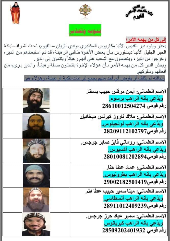 وأورد البيان ٦ من أسماء طلاب الرهبنه المستبعدين وأسماء الشهرة التى يستخدمونها خلال تحركاتهم وهم ايمن مرقص حبيب( الراهب برسوم) ٬ ملاك ناروز ( الراهب لونجينوس) ٬ رومانى فايز(الراهب اكسيوس) ٬ عماد غطاس(الراهب بطرونيوس) ٬مينا سمير( الراهب انسطاسى ) ٬سمير عياد(الراهب كيريانوس) .