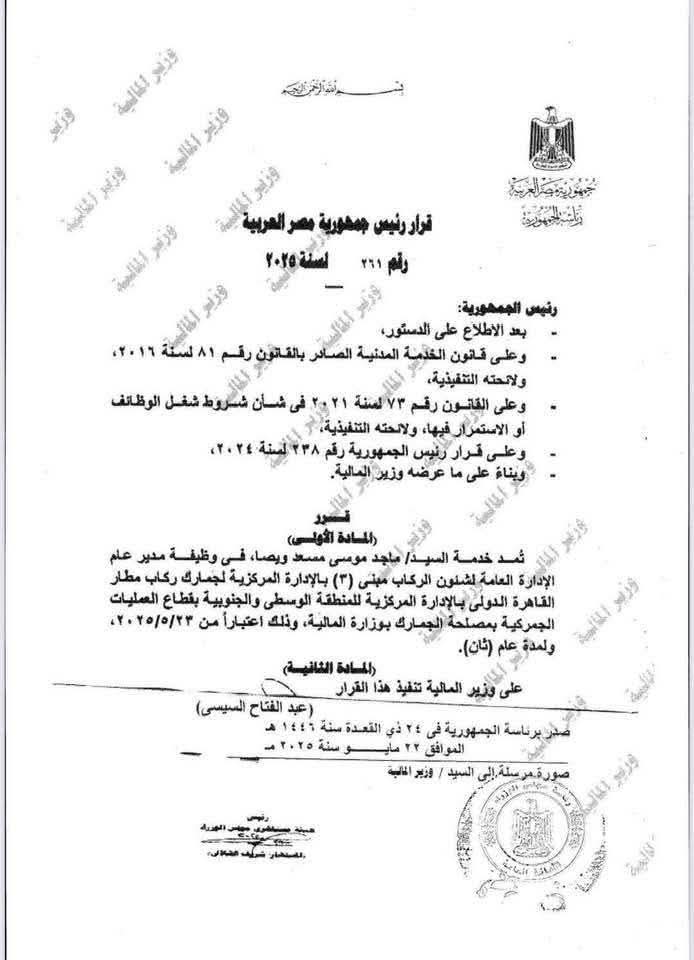 أصدر الرئيس عبد الفتاح السيسي القرار رقم 261 لسنه 2025 بعد الإطلاع على الدستور وقانون الخدمة المدنيه وقانون 73 بشأن شغل الوظائف والإستمرار فيها وايضا القرار رقم 238 لسنه 2024 للسيد رئيس الجمهورية بمد خدمة ماجد موسى سعد فى وظيفة مدير عام الإدارة العامه لشؤون الركاب بـ الإدارة المركزية لـ جمارك ركاب مطار القاهرة الدولى وذلك إعتبارا من 23 /2025/5 .