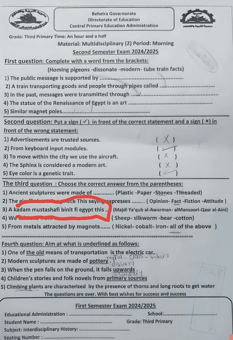 سؤال بالفرانكو لامتحان ثالثة ابتدائي يثير الغضب.. ومحافظة البحيرة تحيل المسؤولين للتحقيق