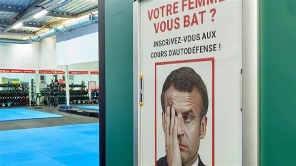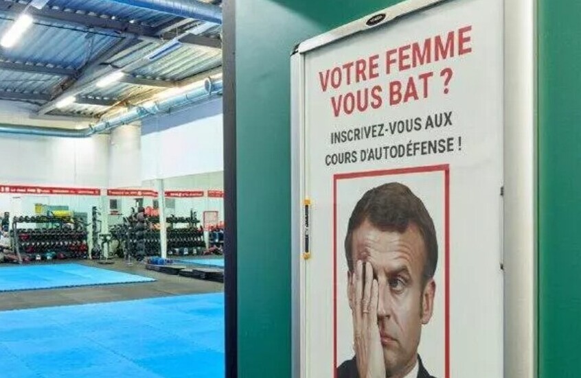 وقال إعلان وضع داخل صالة ألعاب رياضية: "زوجتك تضربك؟ سجل في دورات الدفاع عن النفس لمزيد من المعلومات، اتصل بالإدارة، وظهر مع الإعلان صورة كبيرة لماكرون ويبدو عليه الغضب وقد غطى عينه وظهرت كدمة شديدة في جبينه.