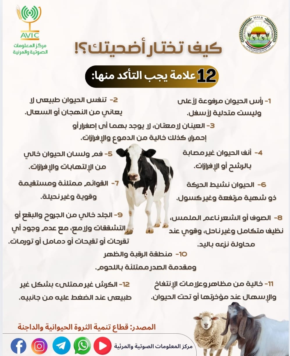 نشر مركز المعلومات الصوتية والمرئية بوزارة الزراعة واستصلاح الأراضي، فيديوهات وملصقات توعوية للمواطنين بكيفية اختيار الأضاحي وعلامات الأضحية السليمة، فضلا عن كيفية التأكد من سلامة اللحوم، وذلك فى إطار الدور التوعوى والإرشادى لوزارة الزراعة.