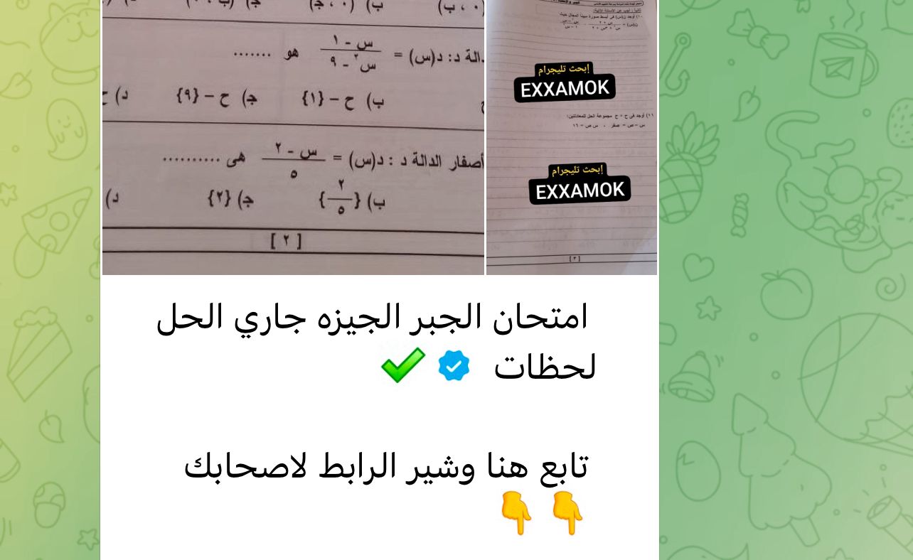 كما نجحت منذ قليل جروبات شاومينج على تليجرام في نشر صور بوكليت امتحان الدراسات الاجتماعية الذي يؤديه طلاب الشهادة الإعدادية 2025 في القاهرة ، وبوكليت امتحان الجبر الذي يؤديه طلاب الشهادة الإعدادية 2025 في الجيزة