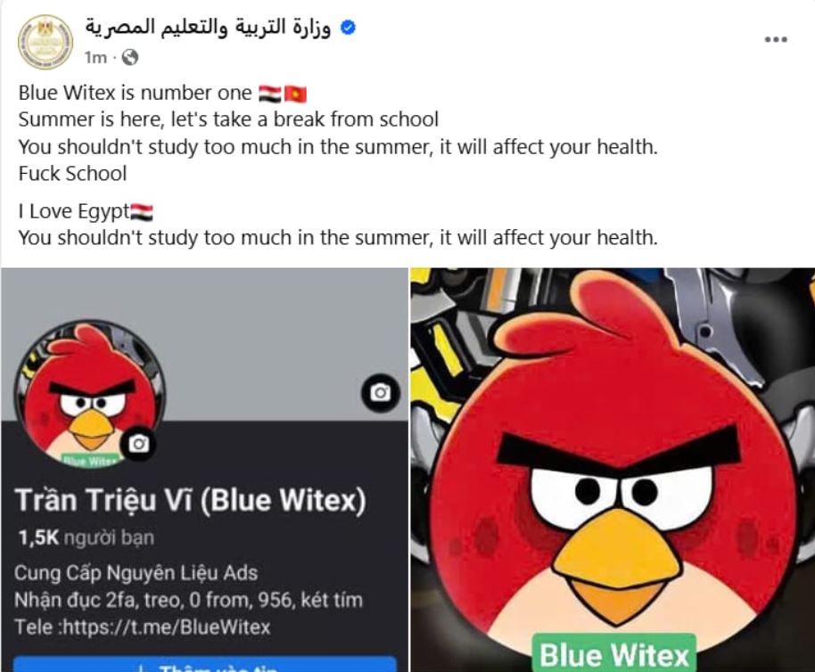 وكشف مصدر مسئول بوزارة التربية والتعليم والتعليم الفني، أنه جرى اختراق الصفحة الرسمية لوزارة التربية والتعليم على موقع التواصل الاجتماعي الفيس بوك، ونشر بوستات لكارتون تنص «الصيف وصل يلا ناخد استراحة من المدرسة ولا يجب أن تدرس كثيرا في الصيف فهذا يؤثر علي صحتك تبا للمدرسة».