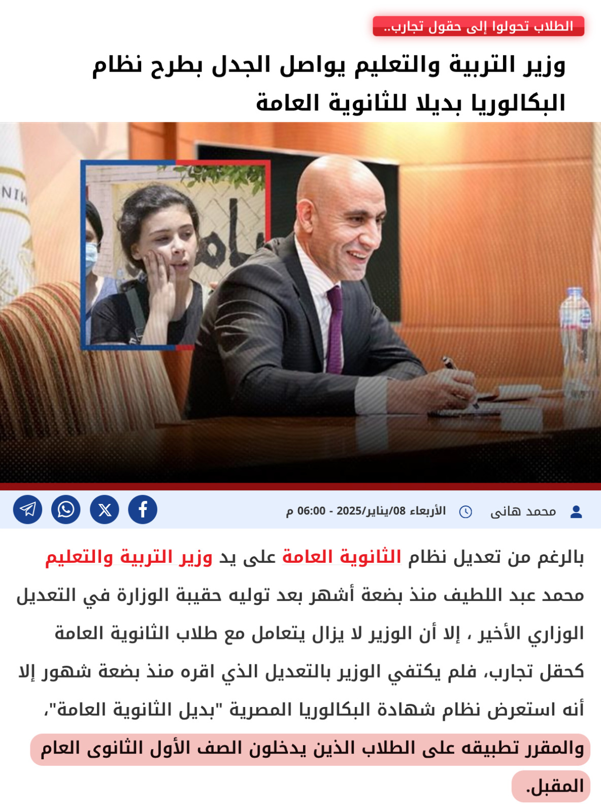 فقد كشف وزير التعليم ، عن أن نظام البكالوريا سيتم تطبيقة بعد 3 سنوات وأن نظام الثانوية العامة مستمر لحين تطبيق النظام الجديد ، بالرغم من أن الوزير حين طرحه لفكرة نظام البكالوريا منذ بضعة أشهر أكد أنه سيتم تطبيقه بداية من العام المقبل، لكن اليوم قال أنه يتم تطبيقه بعد 3 سنوات .