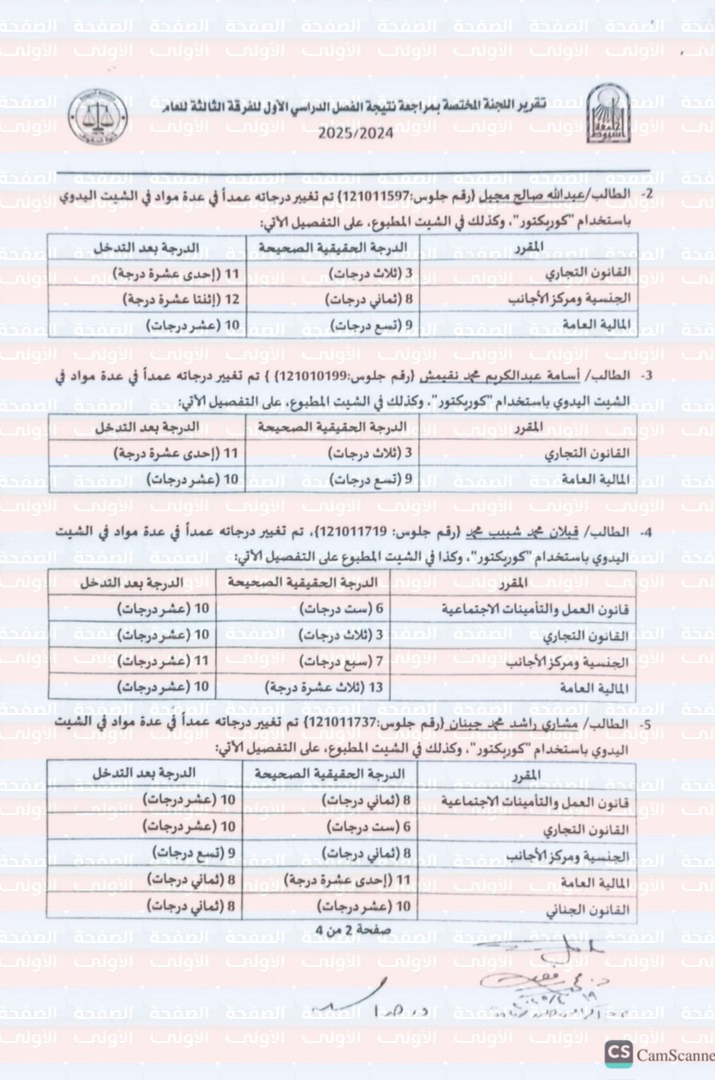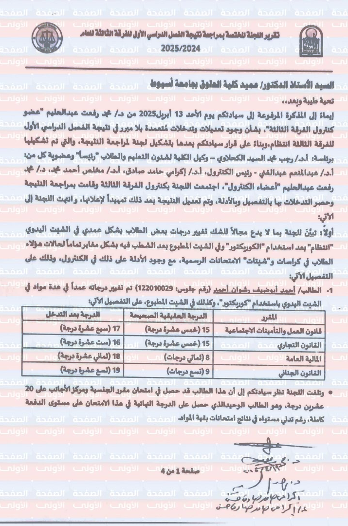 كشف تقرير اللجنة المشكلة في كلية الحقوق جامعة أسيوط، والمختصة بمراجعة نتيجة الفصل الدراسي الأول للفرقة الثالثة للعام الدراسي 2025/2024، عن تدخل أحد الدكاترة أعضاء الكنترول لتعديل نتيجة بعض الطلاب بعينهم، من خلال استخدام "الكوريكتور" لشطب الدرجات وكتابة غيرها، مع تغيير حالة بعض الطلاب من متغيبين عن الامتحان إلى حاضرين وإضافة درجات وهمية، وهو ما حدث ما طالب ثبت غشه من خلال محضر غش رسمي، ولكن الدكتور رصد له درجة تحقق نجاحه في المادة.