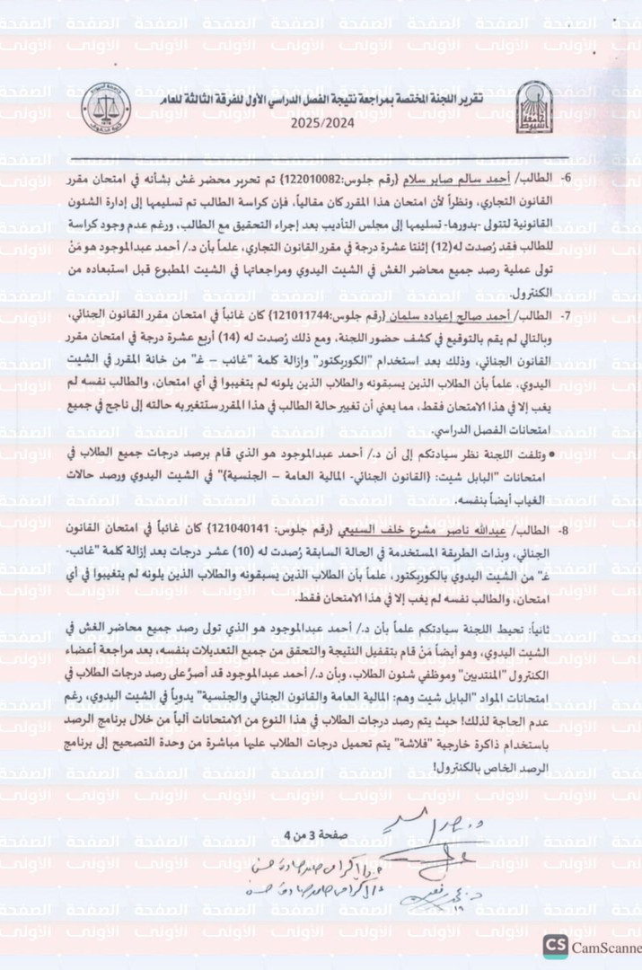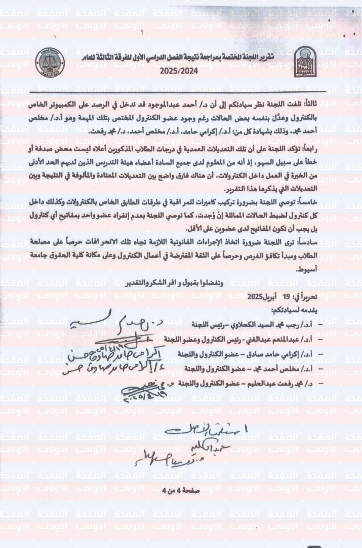 كما طالبت اللجنة بضرورة اتخاذ الإجراءات القانونية اللازمة تجاه تلك الانحرافات حرصاً على مصلحة الطلاب ومبدأ تكافؤ الفرص وحرصاً على الثقة المفترضة في أعمال الكنترول وعلى مكانة كلية الحقوق جامعة أسيوط.
