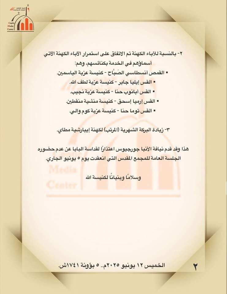 وأشار البيان الذى حصلت - الصفحة الأولى على نسخه منه- إلى توجه وفد كنسي برئاسة الأنبا يوأنس ـ سكرتير المجمع المقدس- إلى كنيسة المناهرة لتسليمها للجنة إشرافيه تضم الدكتور شكرى ناشد و اللواء عادل دانيال بجانب مندوب عن كل إيبارشية من الإيبارشيات الأربعه وتقرر الإبقاء على الخمسة كهنه فى كنائسهم وعدم الإعتداد بقرارات إيقاف سابقه لهم وهم القمص انسطاسى الصباح- كنيسة عزبة الياسمين- و القس ايليا جابر – كنيسة عزبة لطف الله والقس ابانوب حنه- كنيسة عزبة نجيب- والقس إرميا اسحق – كنيسة منشيه منقطين- والقس توما حنا- كنيسة عزبة كوم والى بالإضافة الى زيادة رواتب كهنة إيبارشية مطاى " البركة الشهرية" .