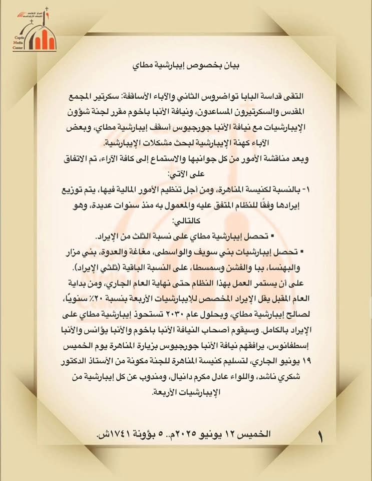وجاء القرار الأول بحسب- بيان الكنيسة القبطية الأرثوذكسية - بإعادة تقسيم إيرادات كنيسة المناهره بحسب النظام القديم على أن تحصل إيبارشية مطاى على نسبه الثلث بينما يتم توزيع ثلثي الإيرادات المتبقية على إيبارشيات "ببا والفشن" و"مغاغة والعدوة" و "بنى سويف والوسطى "و "بنى مزار والبهنسا " ويستمر العمل بهذا النظام حتى نهاية العام ومع بداية العام الجارى تقل الإيرادات المحوله للإيبارشيات الأربعه بنسبه ٢٠٪ سنويا لصالح إيبارشية مطاى وبحلول ٢٠٣٠ ترجع صافى الإيرادات كامله لها.