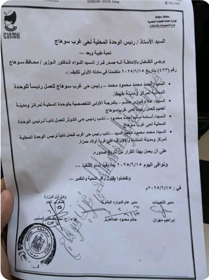تكليف / أحمد محمد محمود محمد، رئيس حي غرب سوهاج، للعمل رئيسًا للوحدة المحلية لمركز ومدينة طهطا.