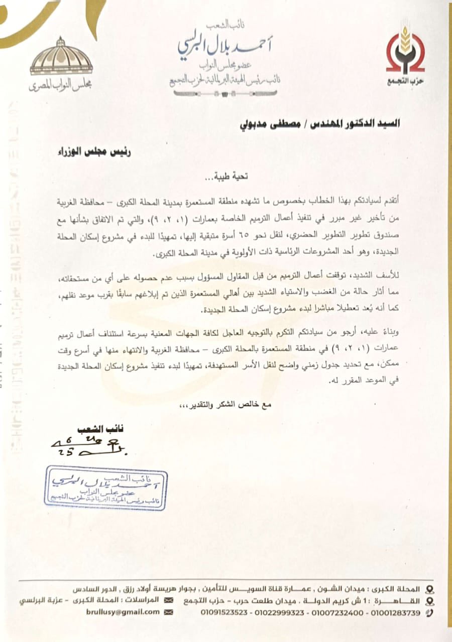 من جانبه، قدم النائب أحمد بلال عضو مجلس النواب، خطابا إلى الدكتور مصطفي مدبولي رئيس مجلس الوزراء، قال فيها: أتقدم لسيادتكم بهذا الخطاب بخصوص ما تشهده منطقة المستعمرة بمدينة المحلة الكبرى - محافظة الغربية من تأخير غير مبرر في تنفيذ أعمال الترميم الخاصة بعمارات (1) (2) (9) والتي تم الاتفاق بشأنها مع صندوق تطوير التطوير الحضري، لنقل نحو 70 أسرة متبقية إليها، تمهيدًا للبدء في مشروع إسكان المحلة الجديدة، وهو أحد المشروعات الرئاسية ذات الأولوية في مدينة المحلة الكبرى .