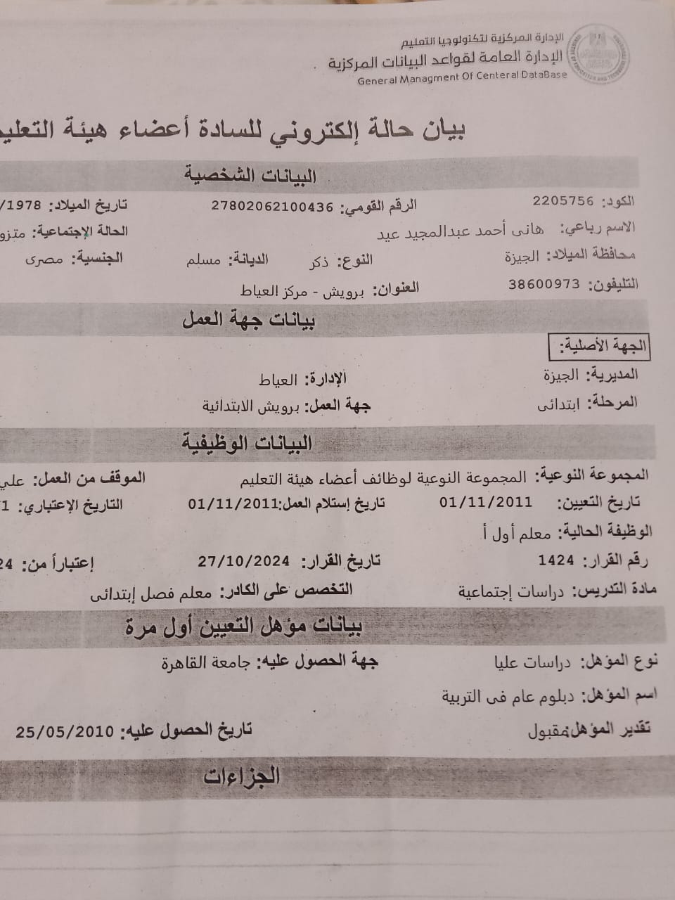 وأضاف في تصريحاته لـ الصفحة الأولى، أنه عمل في المرحلتين الابتدائية والإعدادية مدرس دراسات اجتماعية، وكان يسند إليه تدريس اللغة العربية والرياضيات للصفوف الأولى لسد العجز في المدرسين، وفوجئ بوجود خطأ في صحيفة الأحوال الإلكترونية، بتصنيفه ضمن كادر معلم فصل ابتدائي، وهو ما يمنعه من تدريس مادتي التاريخ والجغرافيا للمرحلة الثانوية، رغم صلاحيته لذلك، هو وزملاؤه من دفعات المعلمين القدامى.