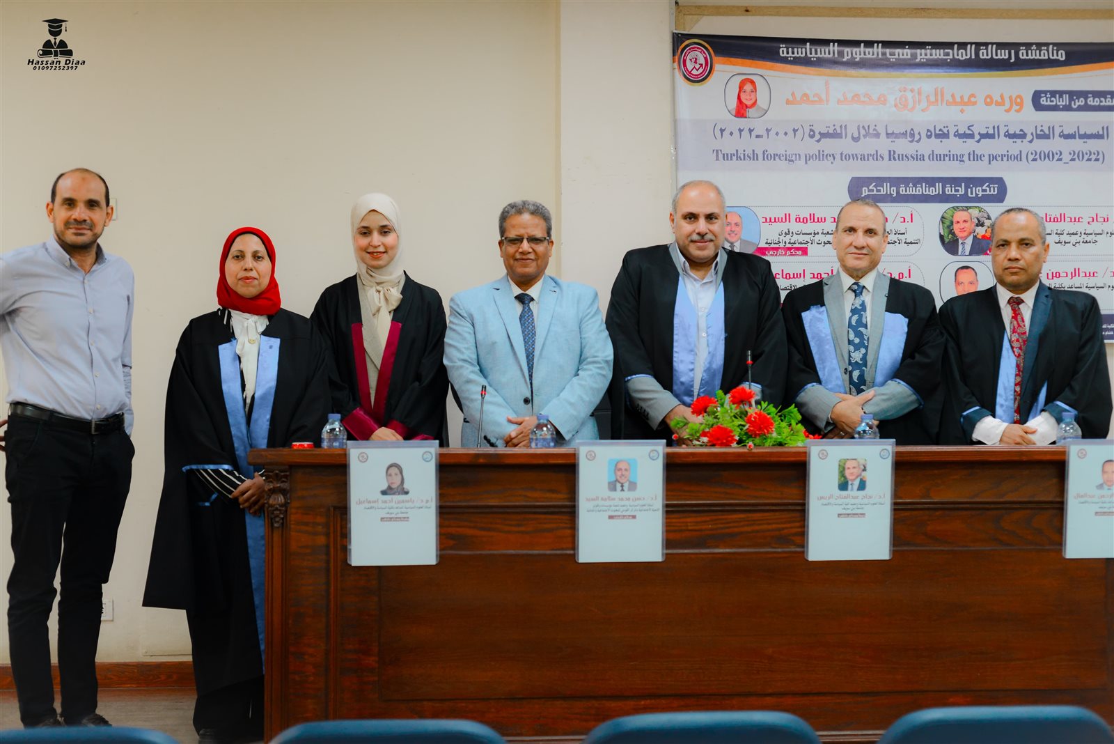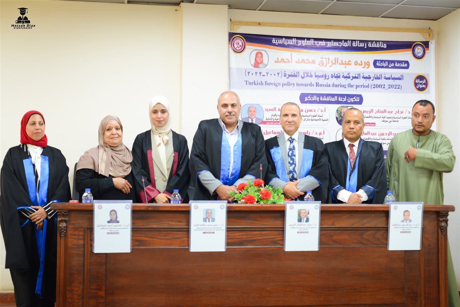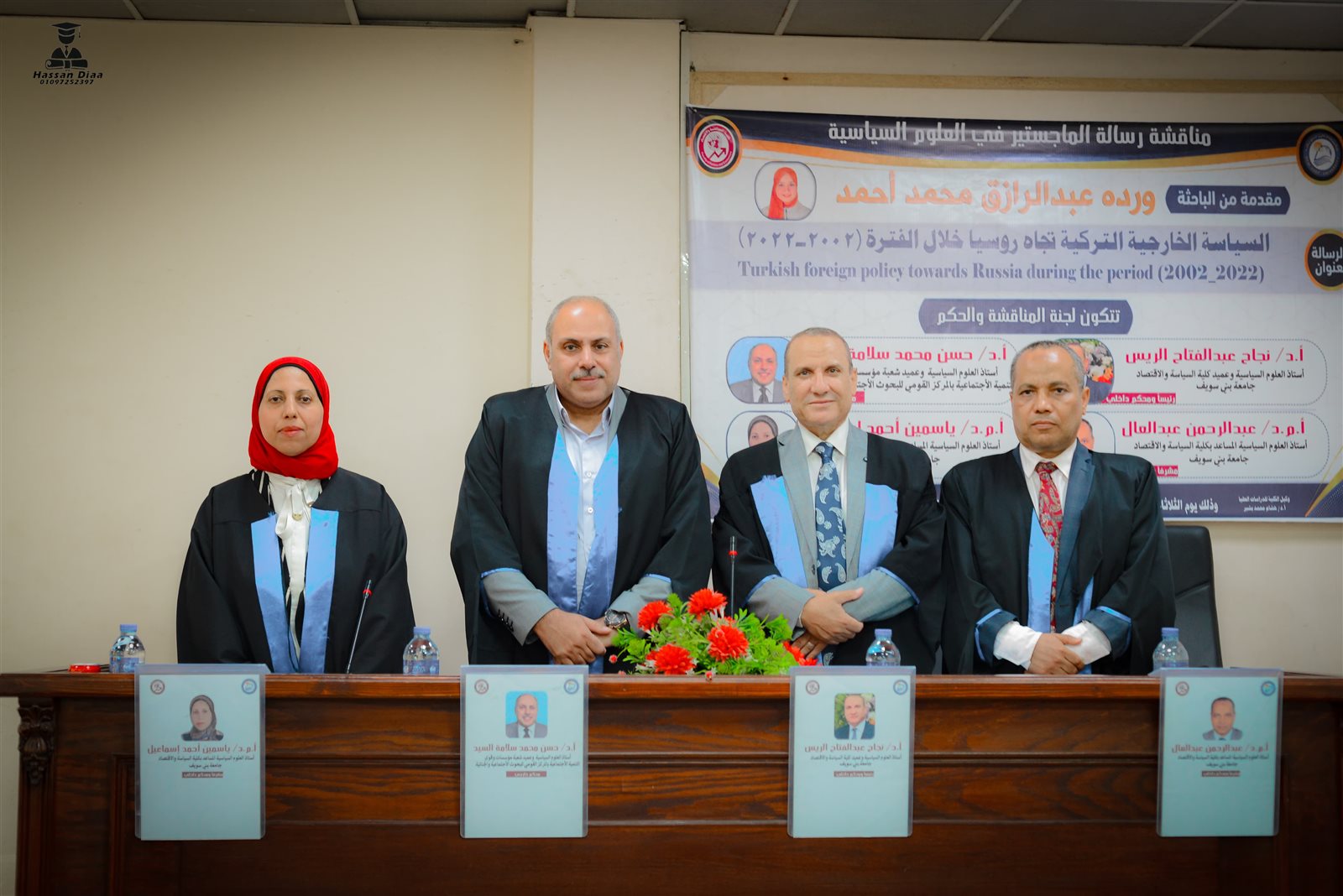 حصلت الباحثة وردة عبد الرازق محمد أحمد، علي الماجستير بـ درجة امتياز في العلوم السياسية من كلية السياسة والاقتصاد جامعة بني سويف ، برسالة تحمل عنوان: "السياسة الخارجية التركية تجاه روسيا خلال الفترة من (2002–2022)".