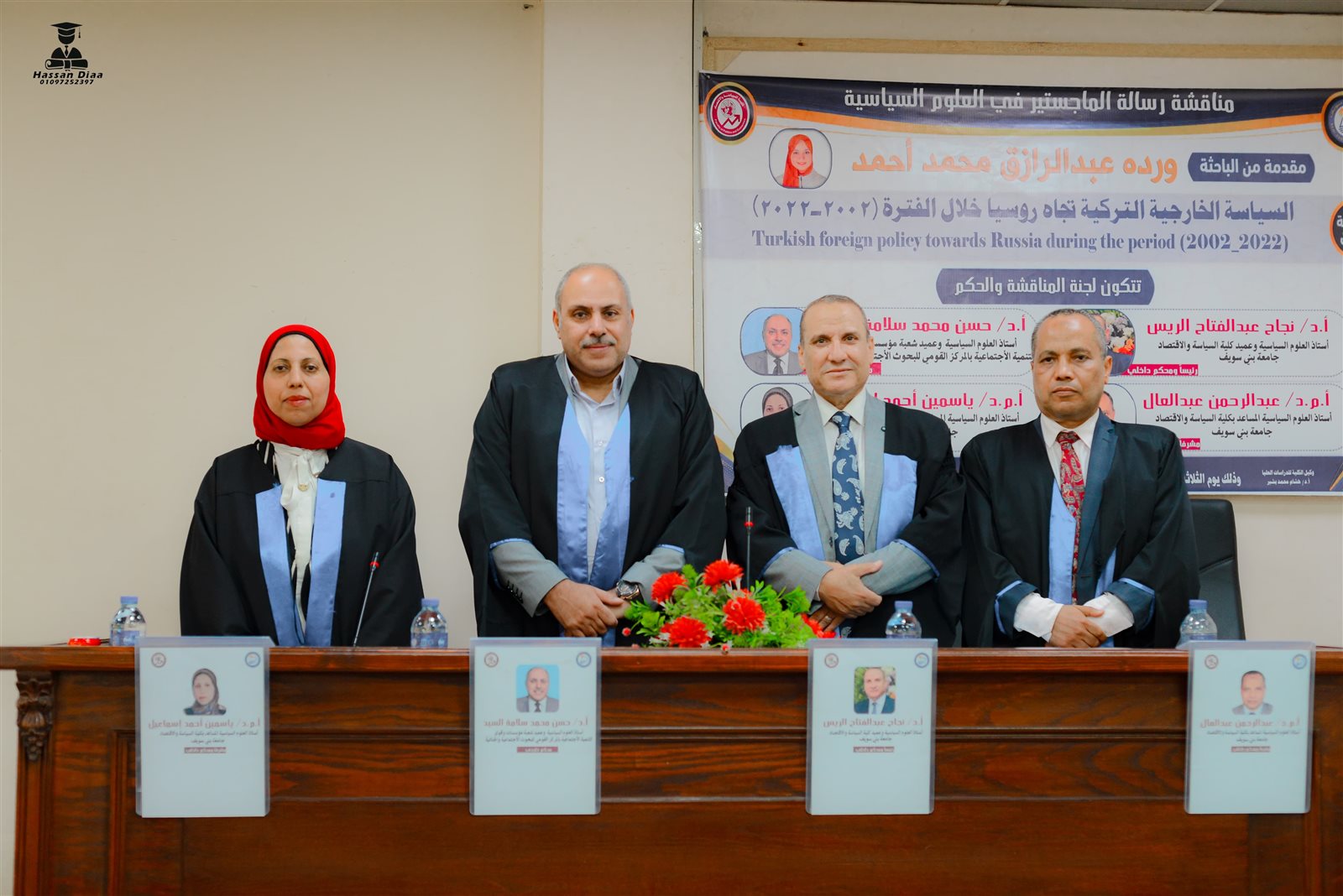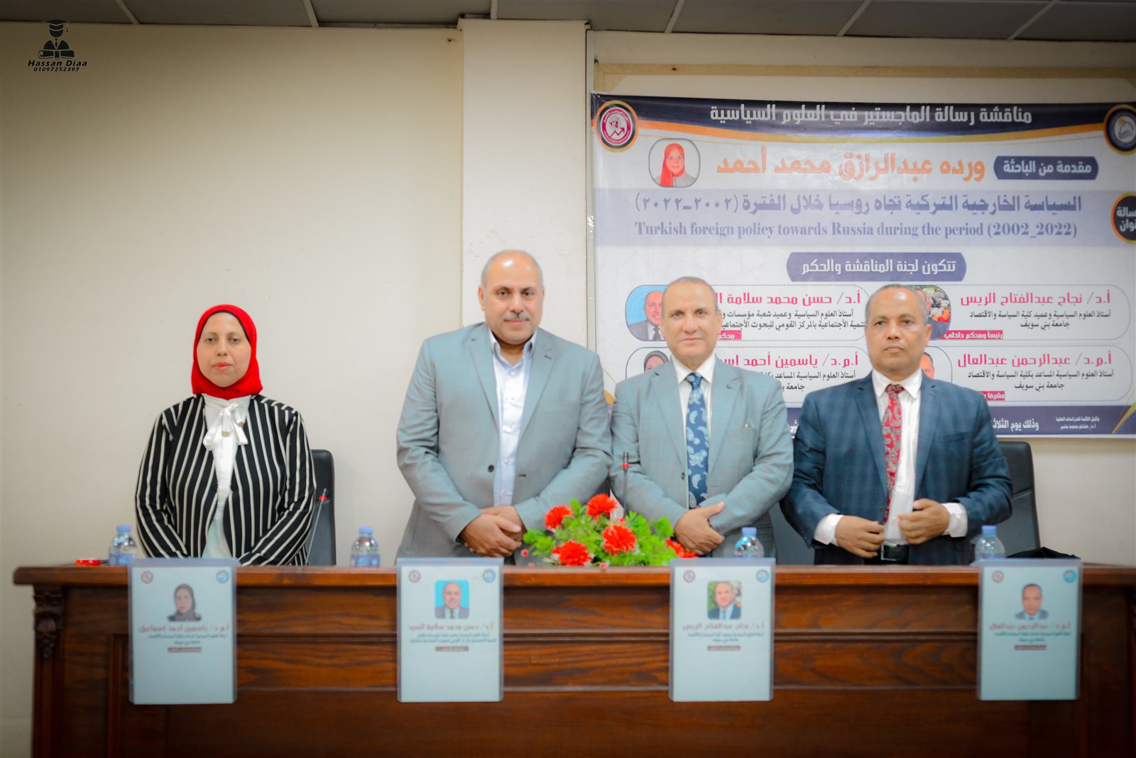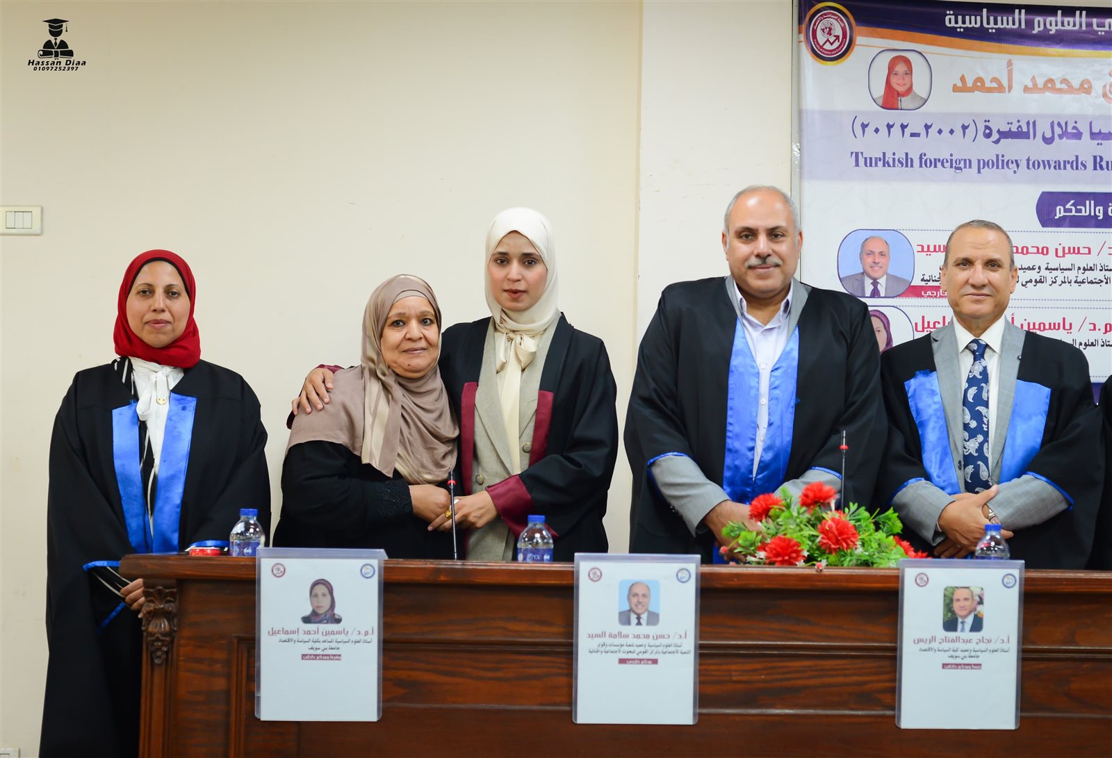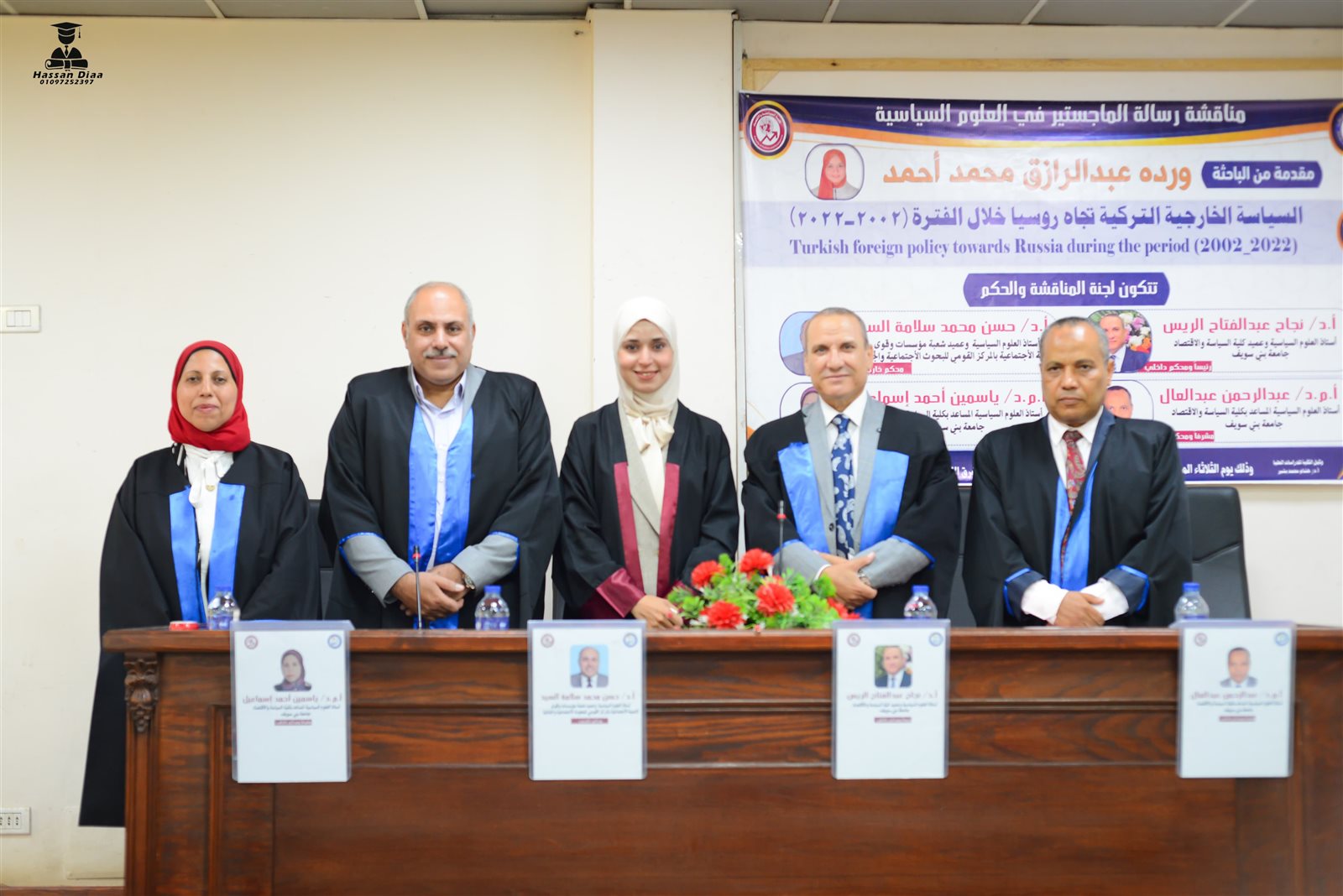 حصلت الباحثة وردة عبد الرازق محمد أحمد، علي الماجستير بـ درجة امتياز في العلوم السياسية من كلية السياسة والاقتصاد جامعة بني سويف ، برسالة تحمل عنوان: "السياسة الخارجية التركية تجاه روسيا خلال الفترة من (2002–2022)".