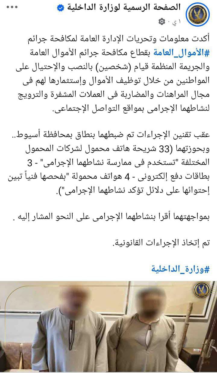 وتوصلت معلومات وتحريات قطاع مكافحة جرائم الأموال العامة والجريمة المنظمة قيام (شخصين ) بالنصب والإحتيال على المواطنين من خلال توظيف الأموال وإستثمارها لهم في مجال المراهنات والمضاربة فى العملات المشفرة والترويج لنشاطهما الإجرامى بمواقع التواصل الإجتماعي.