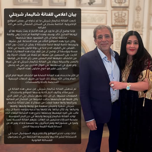 تابعت الفنانة شاليمار شربتلي ما تم تداوله في بعض المواقع الإلكترونية الخاصة بشجار في الساحل الشمالي كانت هي احد اطرافه فإننا نوضح أن كل ما ورد في هذه الأخبار لا يمتّ بصلة لها أو لزوجها المخرج خالد يوسف وهذه الواقعة لم تحدث وهي واقعة مختلقة تماما ان كان المقصود منها شخصها ،