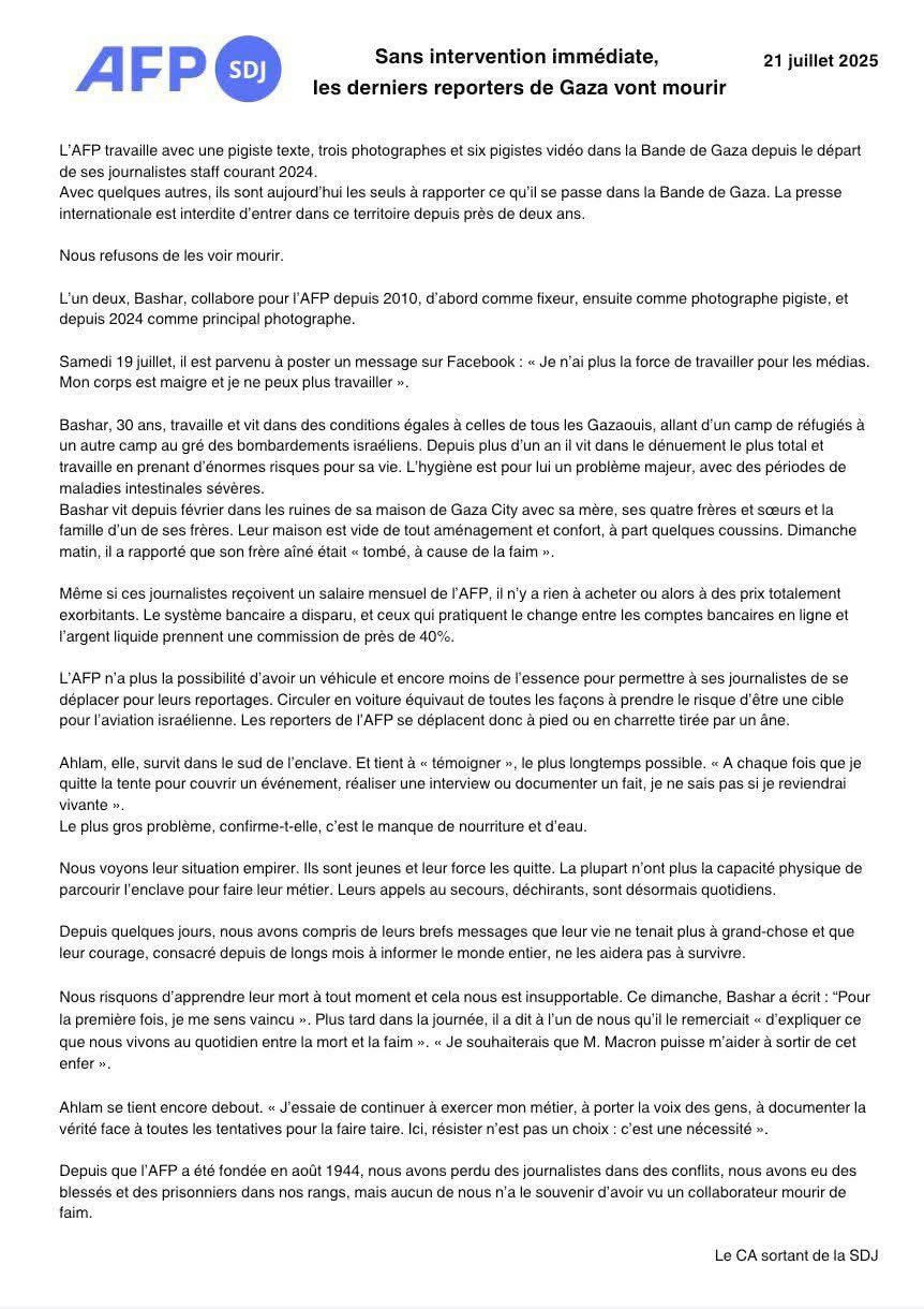 وأضاف البيان: أحدهم، بشار، يعمل مع AFP منذ عام 2010، بدأ كمساعد ميداني، ثم كمصور حر، ومنذ 2024 أصبح المصور الرئيسي. في يوم السبت 19 يوليو، تمكن من نشر رسالة على فيسبوك قال فيها: لم تعد لدي القوة للعمل في وسائل الإعلام، جسدي نحيف ولا أستطيع العمل بعد الآن.