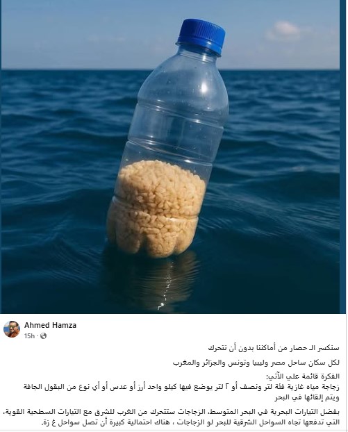 وأضاف : بفضل التيارات البحرية في البحر المتوسط، الزجاجات ستتحرك من الغرب للشرق مع التيارات السطحية القوية، التي تدفعها تجاه السواحل الشرقية للبحر لو الزجاجات، هناك احتمالية كبيرة أن تصل سواحل غزة، لأن البحر المتوسط مليء بالتيارات التي تساعد الزجاجات على التحرك لمسافات طويلة، ووجود مواد داخل الزجاجات تجعلها تطفو لفترة طويلة، يعني الزجاجات ستظل في البحر حتى تصل للهدف
