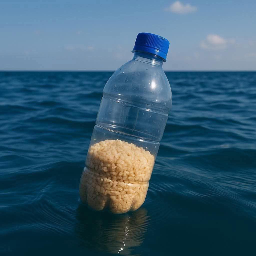 زجاجة مياه غازية فئة لتر ونصف أو ٢ لتر يوضع فيها كيلو واحد أرز أو عدس أو أي نوع من البقول الجافة ويتم إلقائها في البحر.