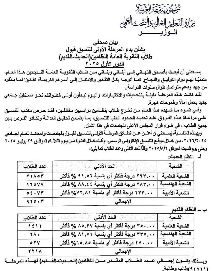 وكان الدكتور أيمن عاشور وزير التعليم العالي قد أعلن عن بدء المرحلة الأولى لتنسيق القبول بالجامعات والمعاهد للعام الجامعي 2025/2026، من خلال موقع التنسيق الإلكتروني الرسمي، وذلك خلال الفترة من يوم الثلاثاء الموافق 29 يوليو 2025 وحتى يوم السبت الموافق 2/8/2025 وفقاً للحد الأدنى وعدد الطلاب كما يلي: