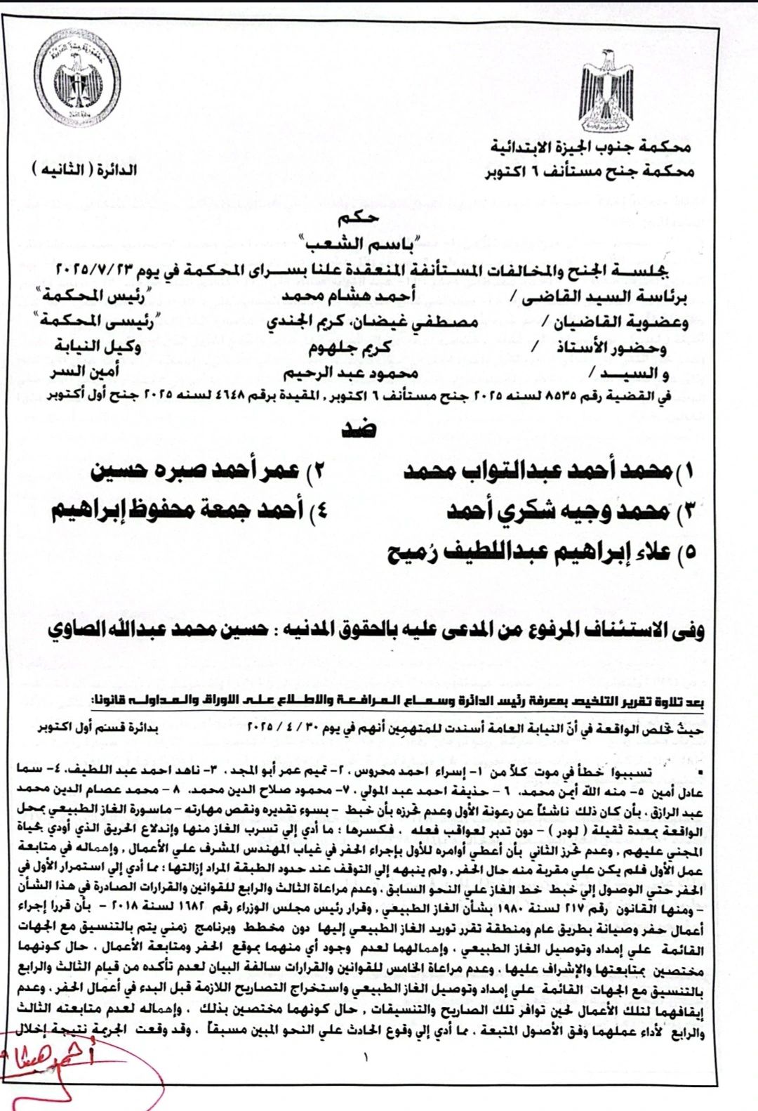 أيدت محكمة جنح مستأنف 6 أكتوبر بسجن 6 متهمين في قضية انفجار خط الغاز على طريق الواحات، والذي تسبب في مصرع 8 أشخاص وإصابة 17 آخرين، وذلك بعد حكم أول درجة بالسجن 10 سنوات لكل منهم، وذلك في القضية رقم 8535 لسنة 2025 جنح مستأنف أكتوبر، المقيدة برقم 4648 لسنة 2025 جنح أول أكتوبر.