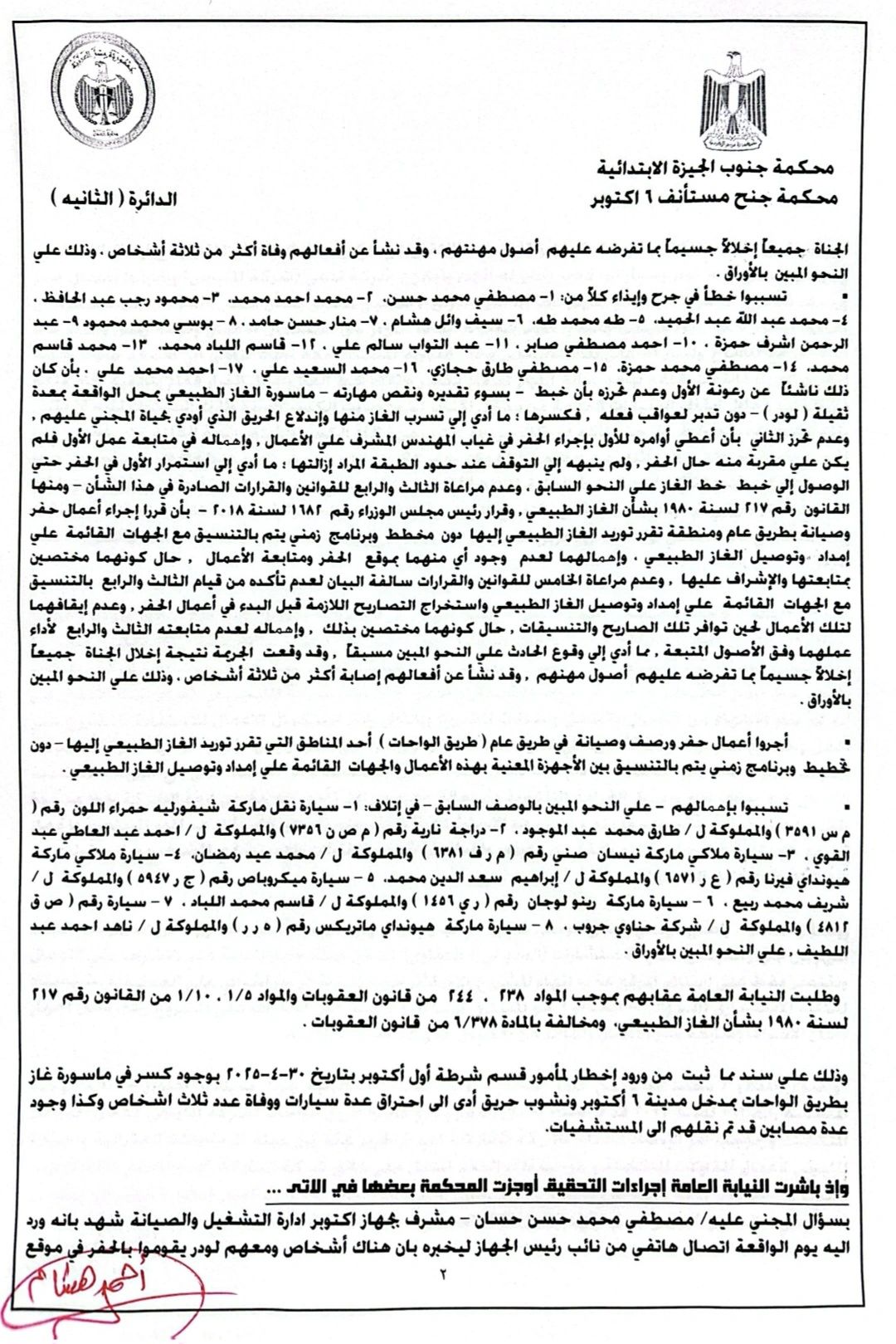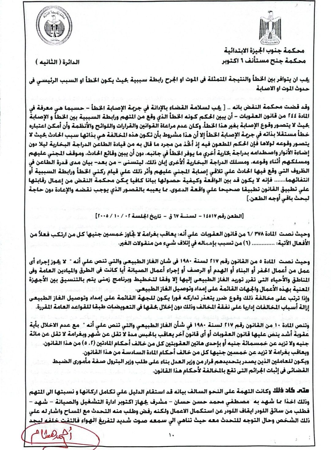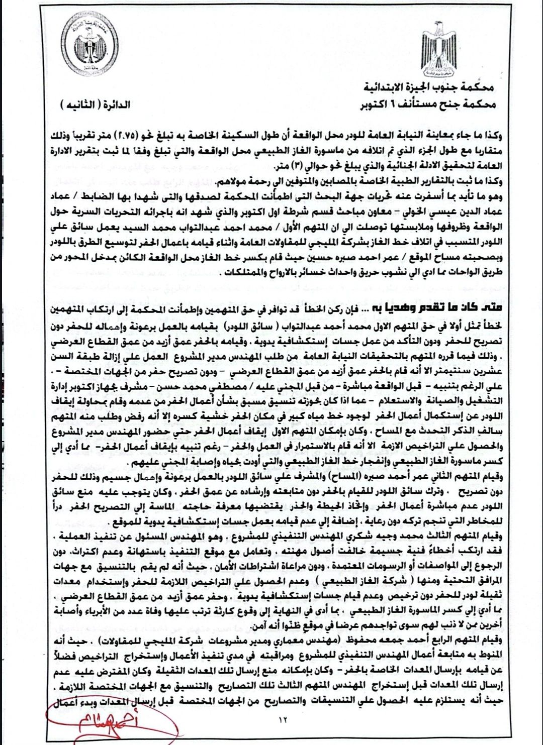 وكانت محكمة جنح أكتوبر، قضت بحبس المتهمين 10 سنوات لكل منهم، بعد إدانتهم بارتكاب عدة مخالفات جسيمة، منها القتل الخطأ، والإصابة الخطأ، والإهمال الفني، ومخالفة الضوابط المنظمة لأعمال الحفر قرب شبكات الغاز الطبيعي.