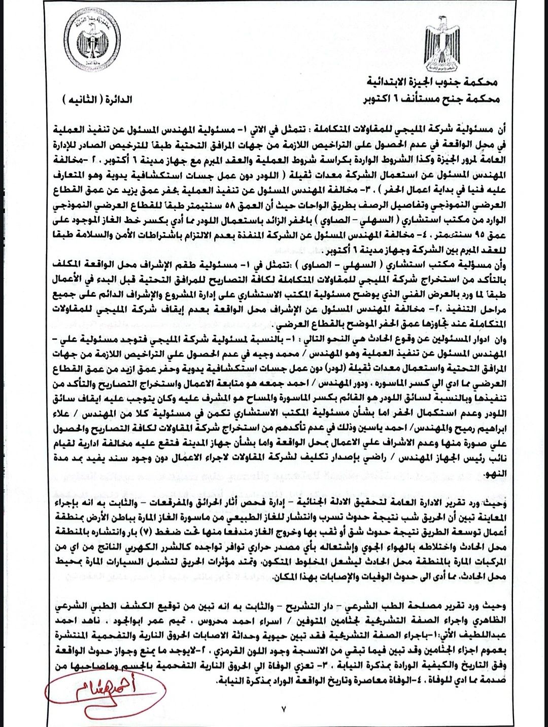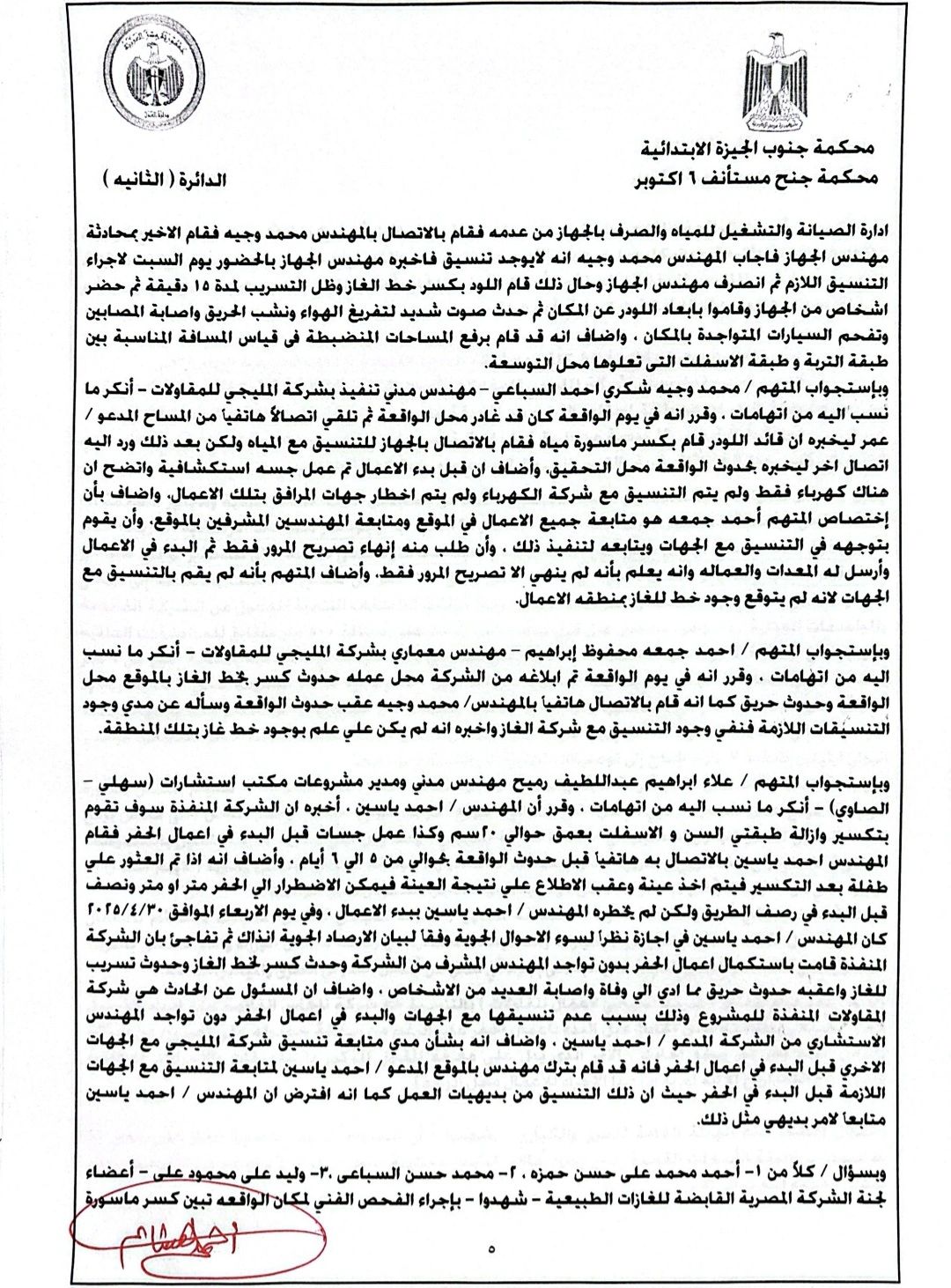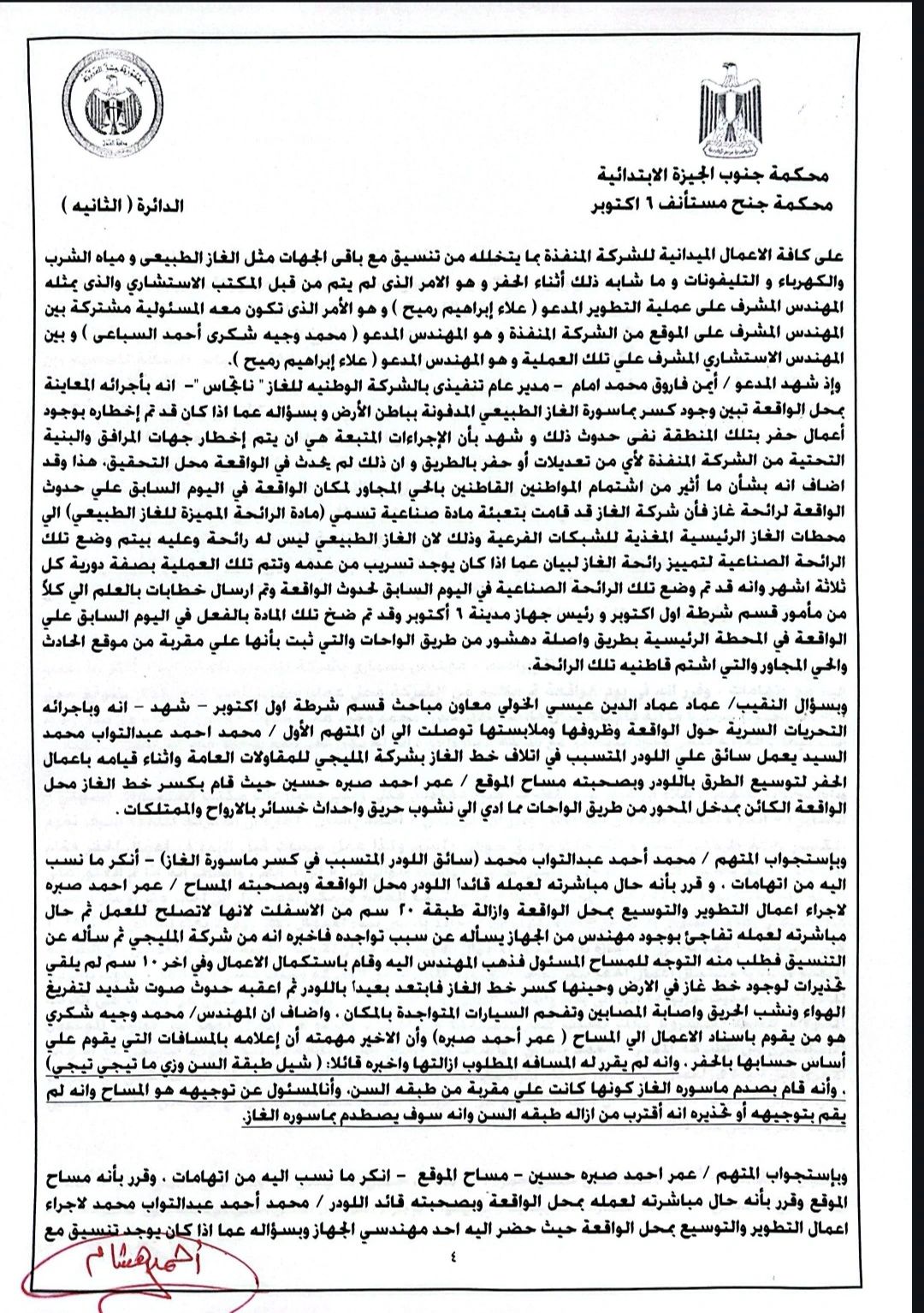 وكانت محكمة جنح أكتوبر، قضت بحبس المتهمين 10 سنوات لكل منهم، بعد إدانتهم بارتكاب عدة مخالفات جسيمة، منها القتل الخطأ، والإصابة الخطأ، والإهمال الفني، ومخالفة الضوابط المنظمة لأعمال الحفر قرب شبكات الغاز الطبيعي.