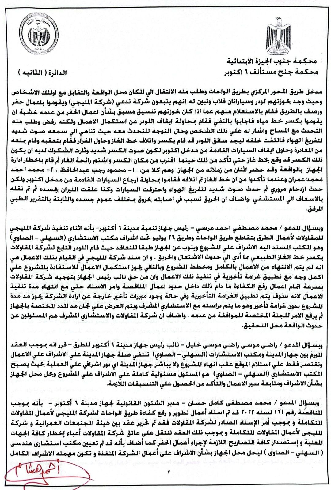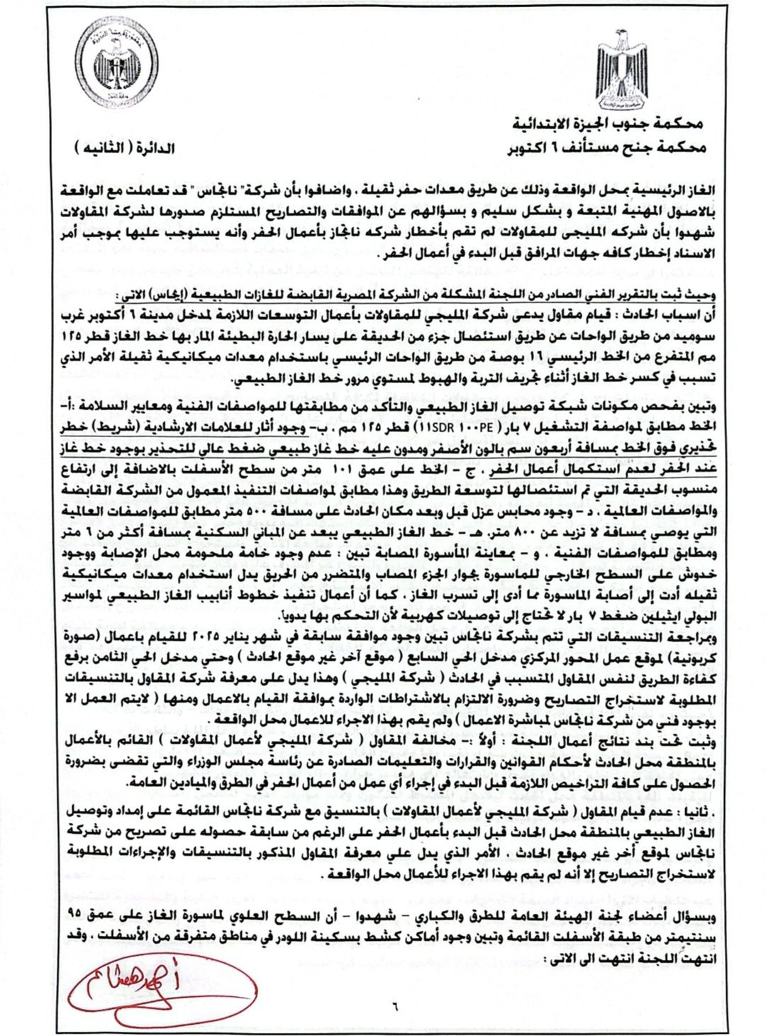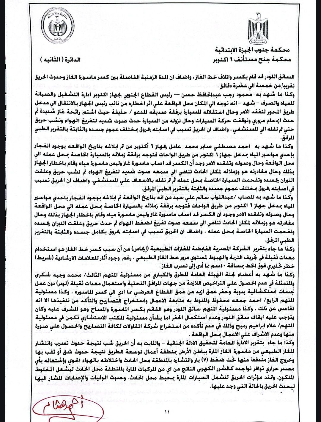 وقالت النيابة إن حادث انفجار خط الغاز على طريق الواحات كان نتيجة مباشرة للإهمال الجسيم، كما نفت وجود أي تسرب سابق على يوم الواقعة، وفق ما أثبتته التقارير الفنية وسجلات الضخ.