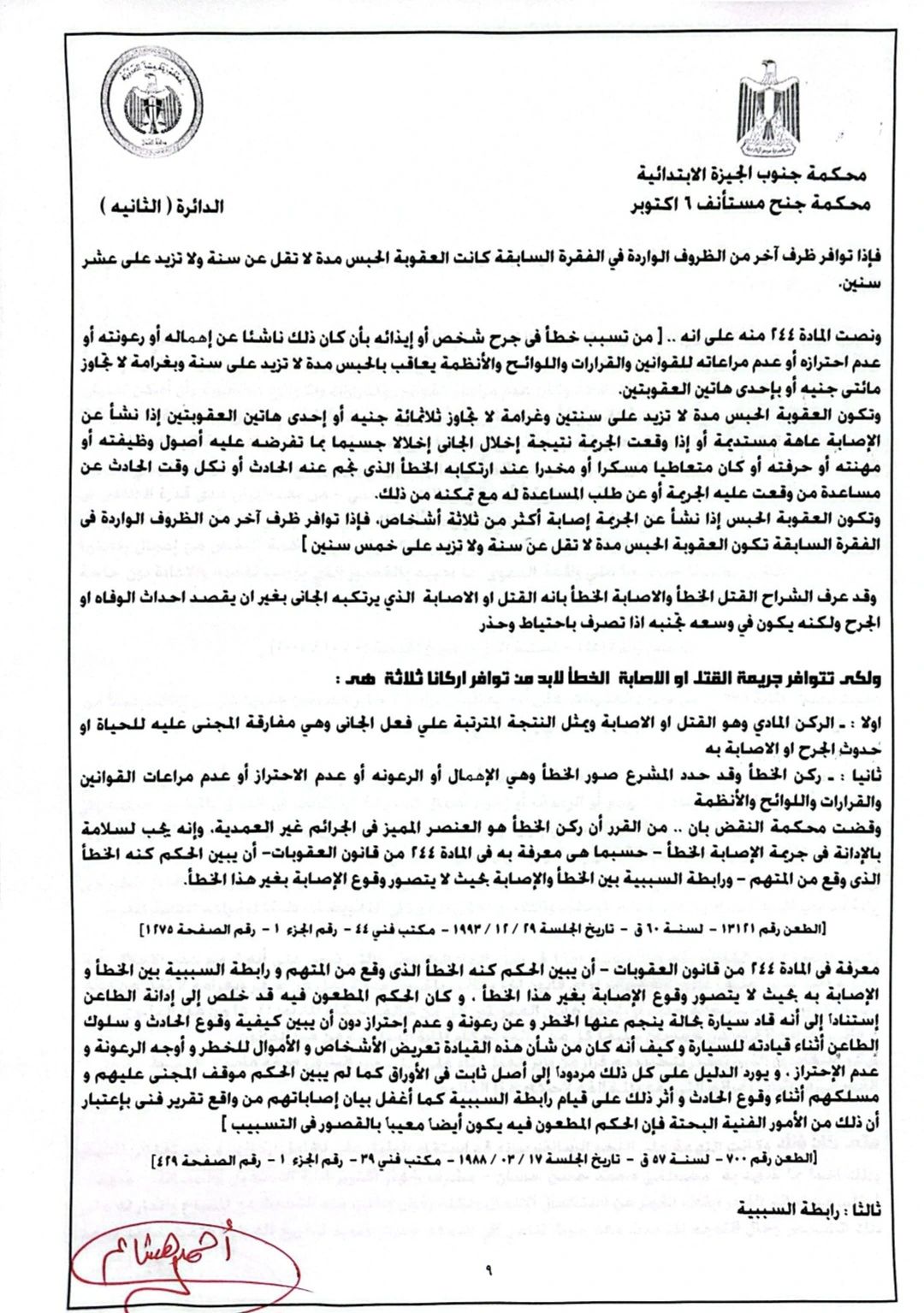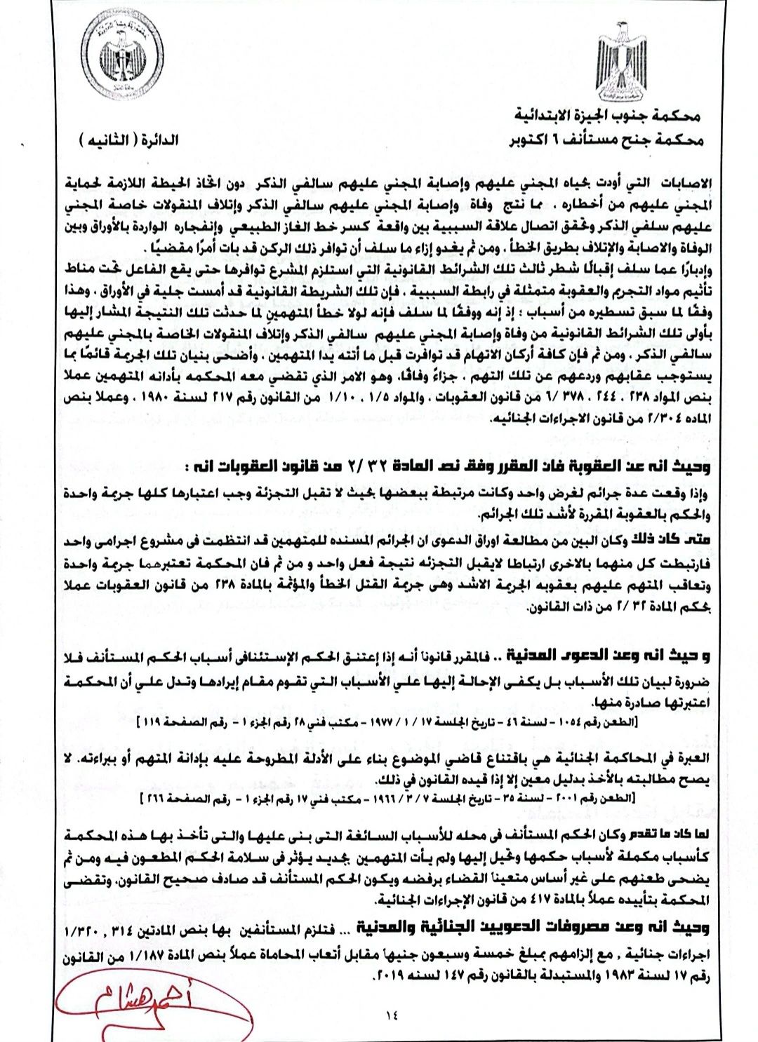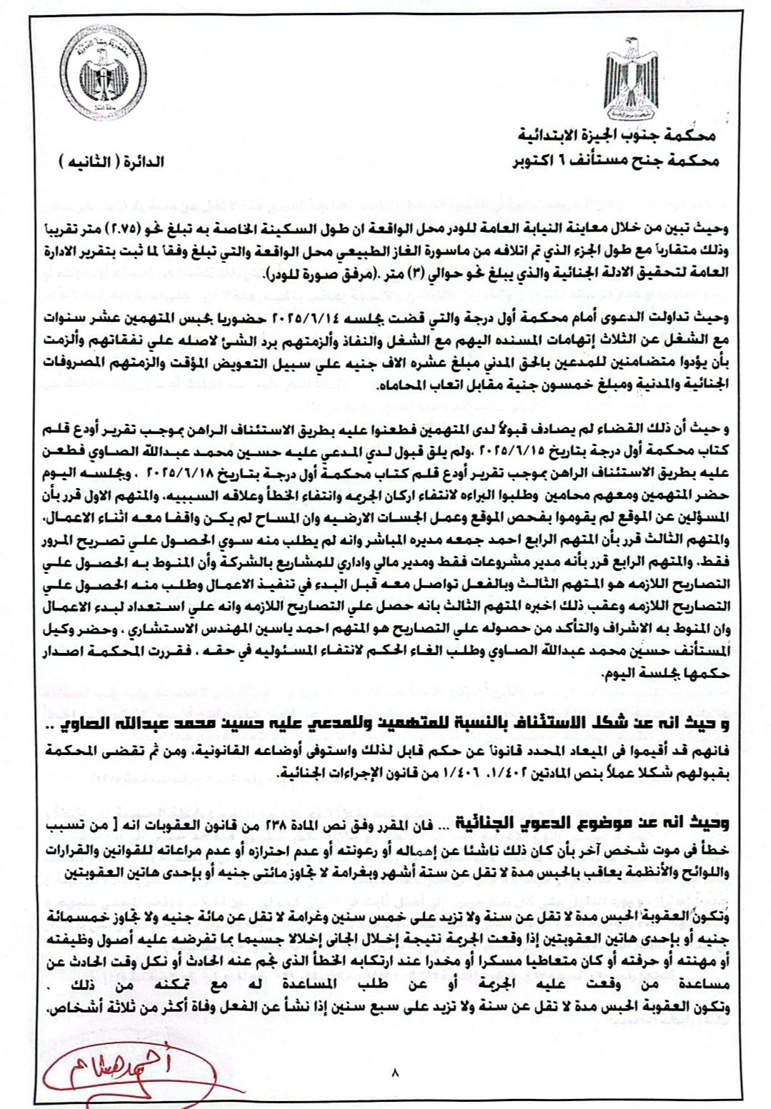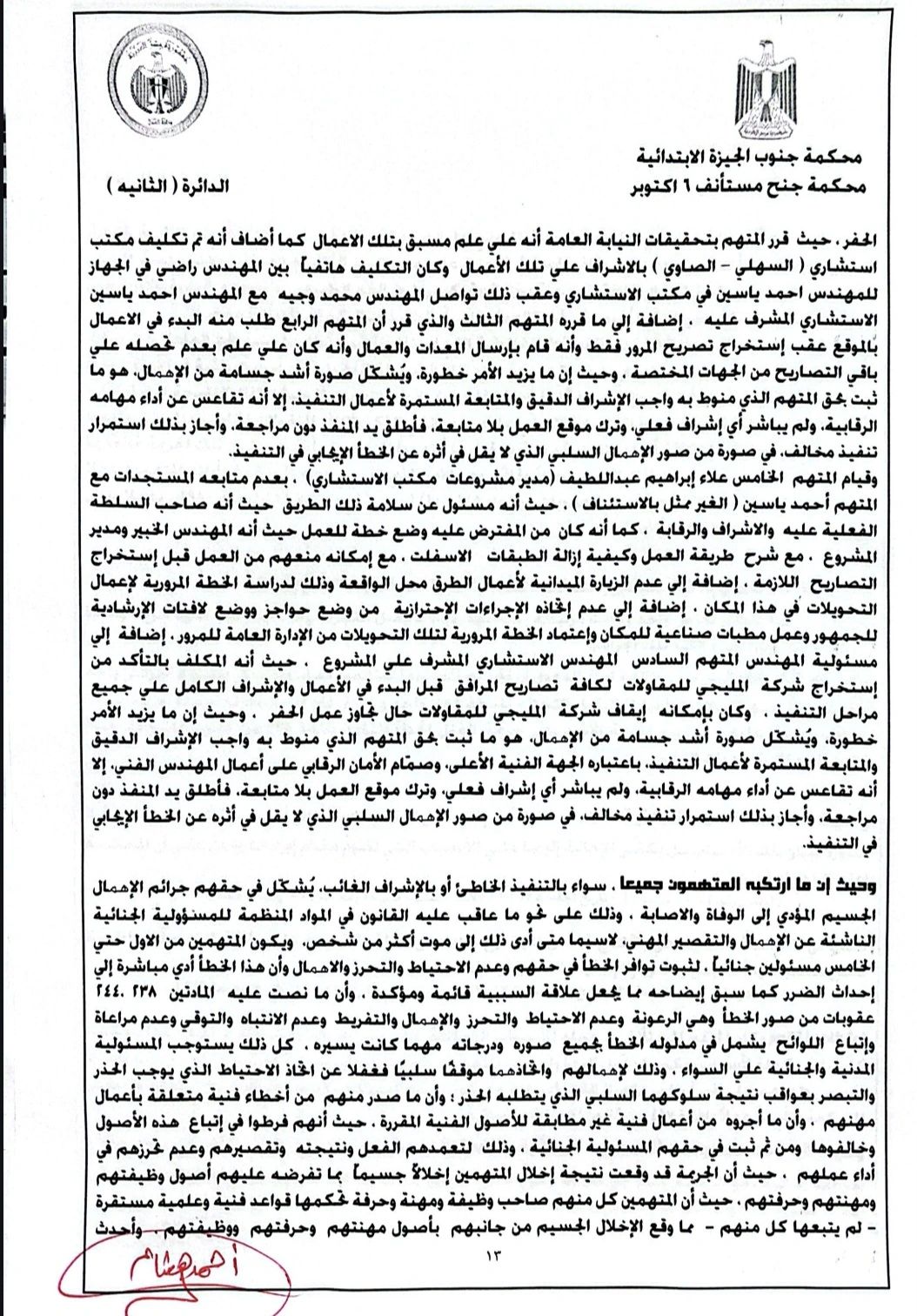 ولفتت محكمة جنح مستأنف 6 أكتوبر، إلى أنها وهي تزن هذا الملف بميزان العدل لا تنظر إلى أرقام أو تقارير فنية فحسب، بل ترى نعوشا تحركت في صمت، وترى أمهات فقدن أبناءهن، وأطفالا باتوا بلا آباء، وكل ذلك لأن المهندس أخطأ، ولم يكن يحق له أن يخطئ