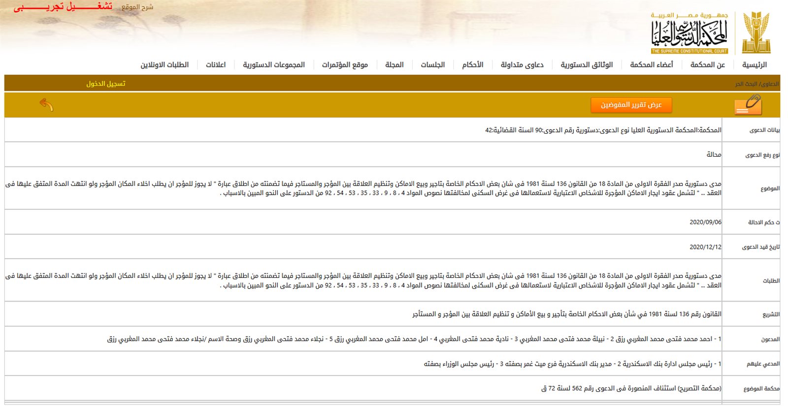 وتم قيد الدعوى أمام المحكمة الدستورية بتاريخ 12 / 12 / 2020، بعد إحالتها من محكمة استئناف المنصورة بتاريخ 6 / 9 / 2020، في الدعوى الأصلية رقم 562 لسنة 72 ق.