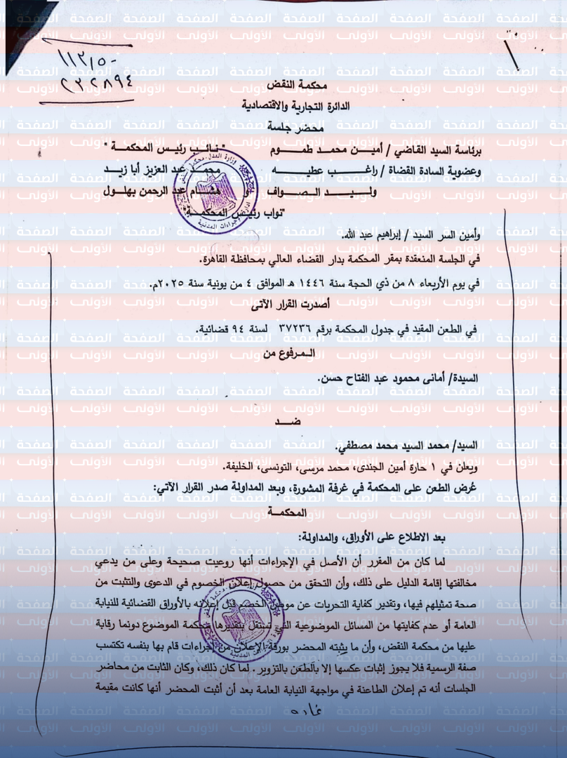 في جلسة هامة عُقدت بمحكمة النقض المصرية – الدائرة التجارية والاقتصادية – يوم الأربعاء 4 يونيو 2025، أصدرت المحكمة قرارًا قضائيًا بارزًا في الطعن رقم 37236 لسنة 94 قضائية، المتعلق بقضية النزاع بين السيدة أماني محمود عبد الفتاح حسن (الطاعنة) والسيد محمد السيد محمد مصطفى (المطعون ضده).