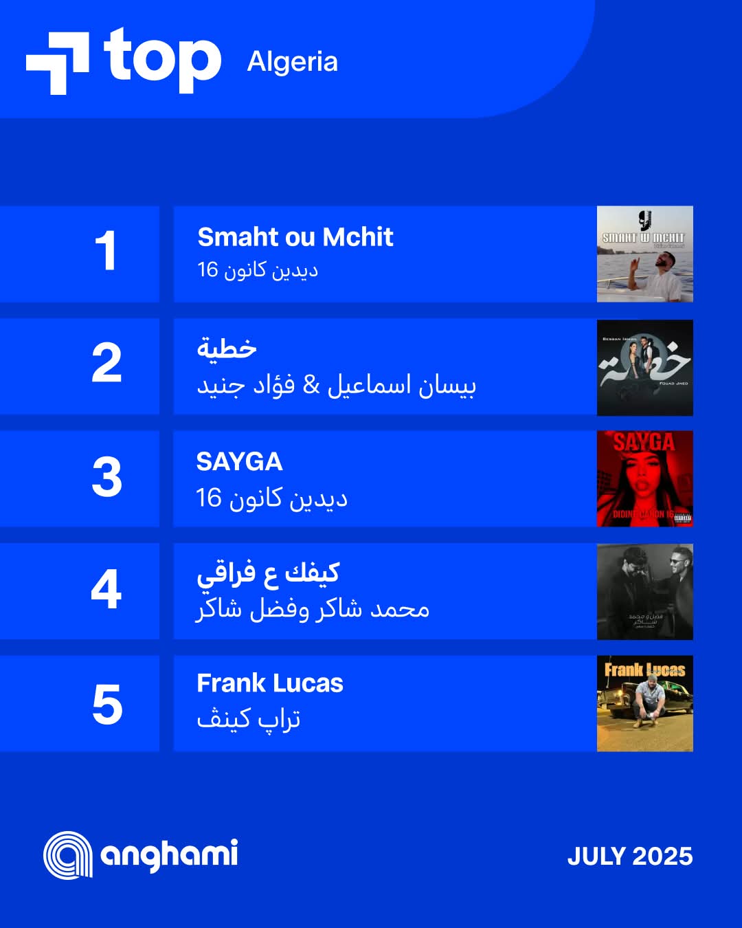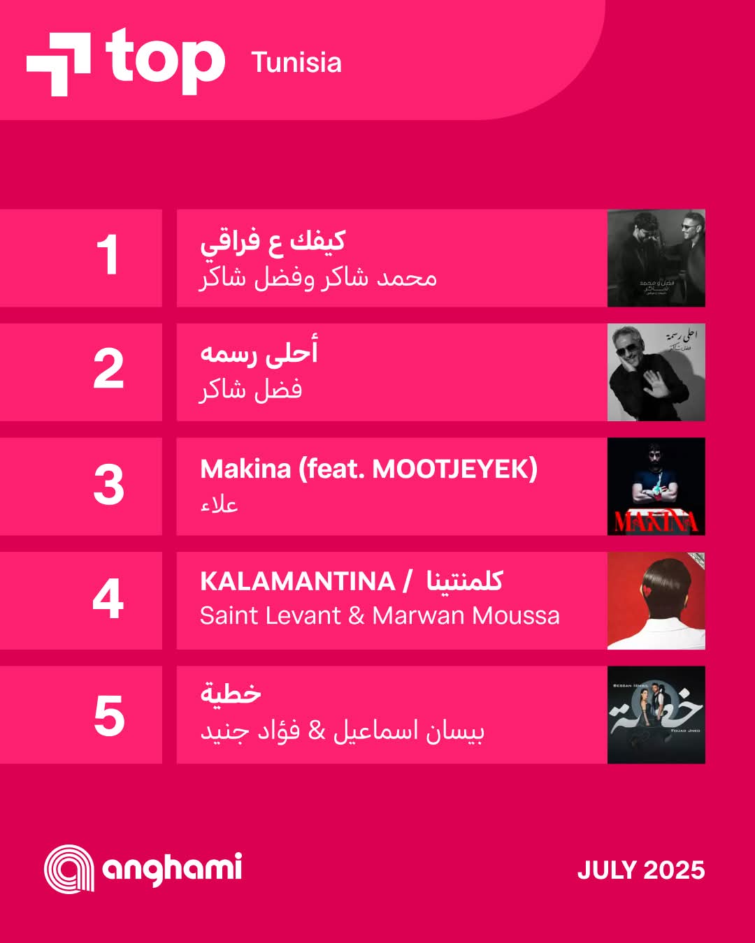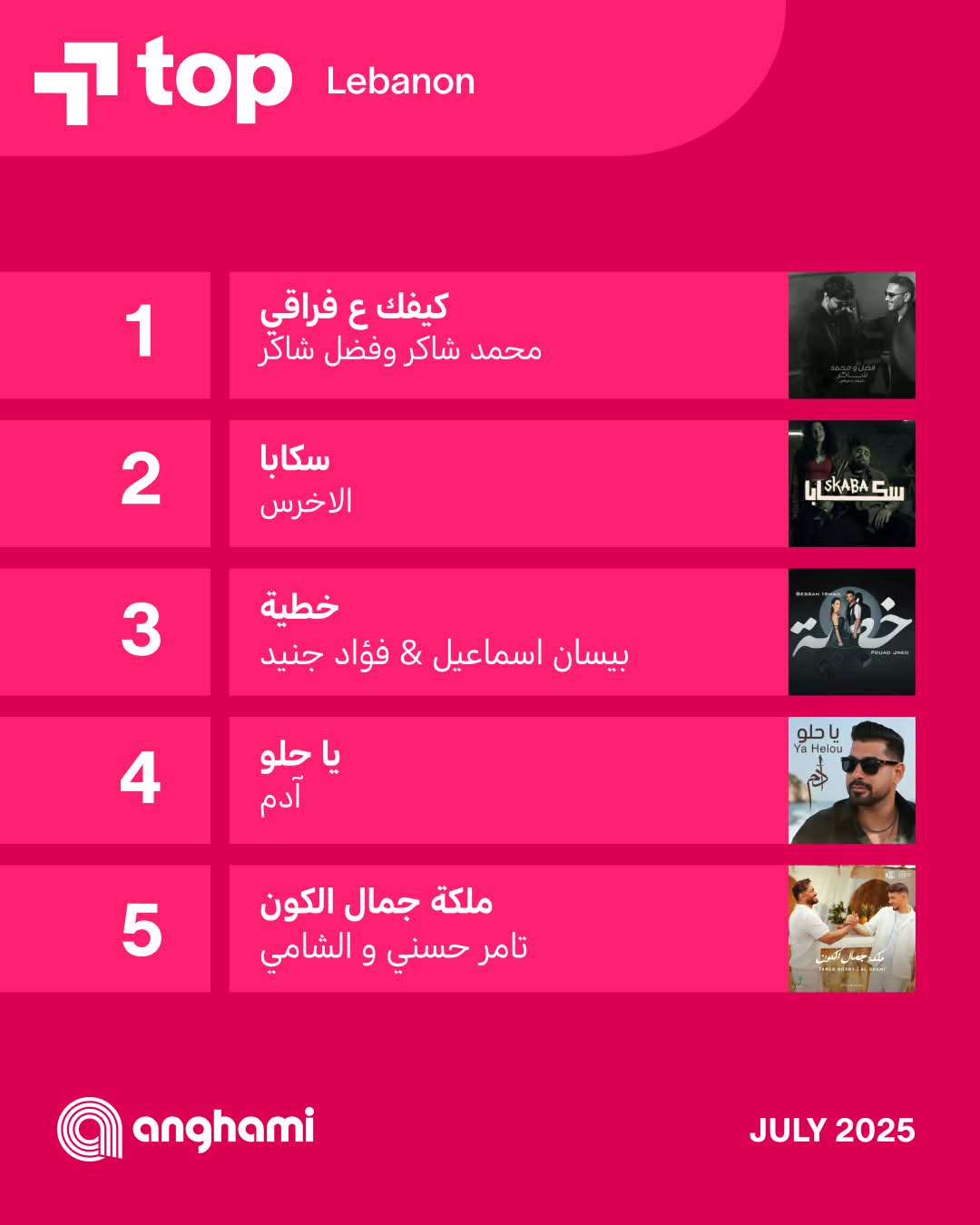 نشرت أنغامي عبرت صفحات التواصل الإجتماعي الخاصة بالتطبيق الأغاني التى تصدرت الاستماعات فى معظم الدول العربية لشهر يوليو فى كلا من مصر، السعودية، العراق، الجزائر، المغرب ، وتونس .